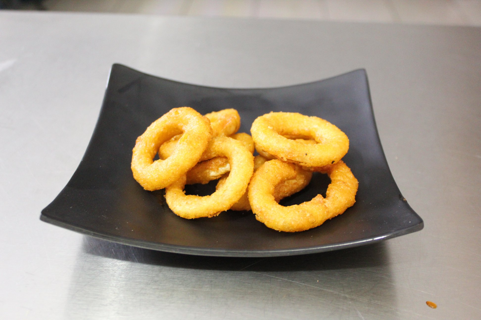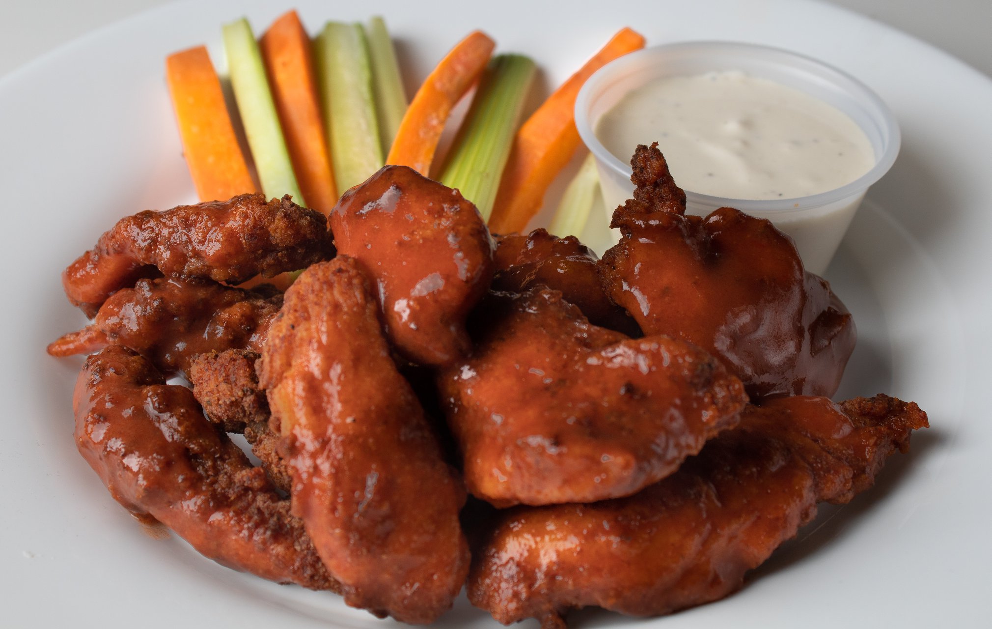 Tiras de pechuga de pollo (calidad bachoco) empanizadas y cubiertas de salsa BBQ o búfalo, acompañadas de varitas de apio, zanahoria y aderezo ranch.