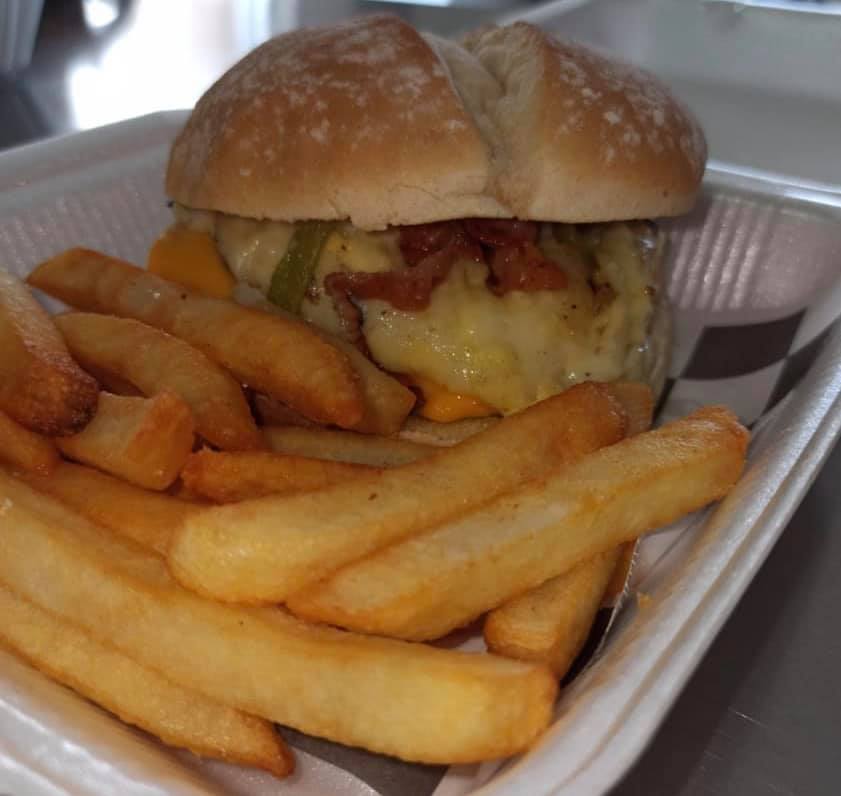 Pan artesanal, porción de boneless en salsa BBQ o búfalo, queso gouda, queso americano, lechuga, tomate, cebolla morada y porción de papas a la francesa.