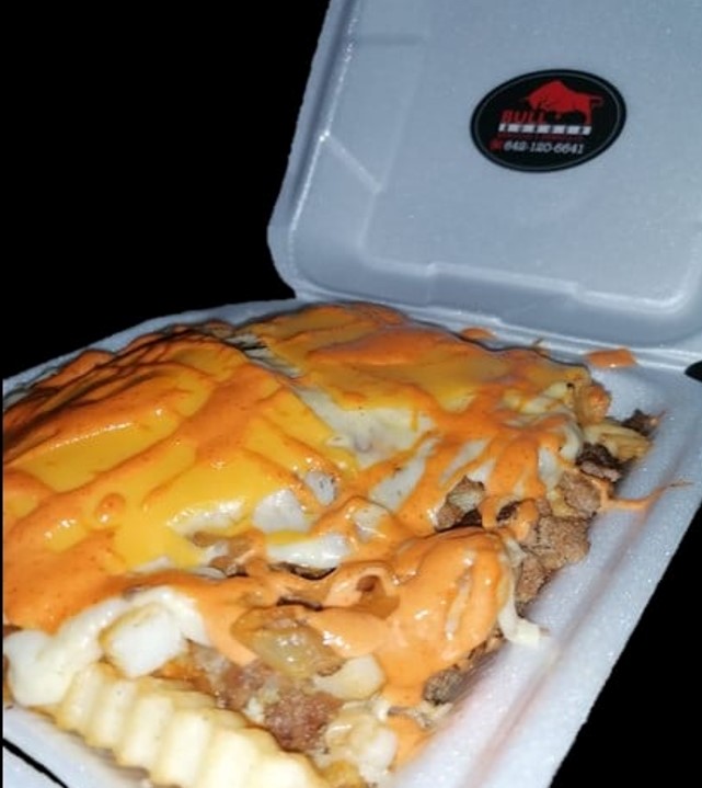 Papas a la francesa con carne, queso americano, queso gouda, cebolla caramelizada y aderezo de la casa. Individuales.