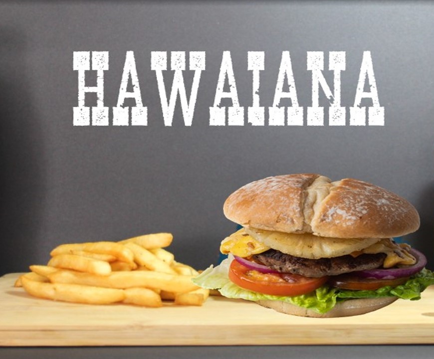 Pan artesanal con mayonesa, carne 100% sirloin, queso americano, queso gouda, rebanada de piña caramelizada, lechuga, tomate y cebolla morada... acompañada de papas a la francesa.