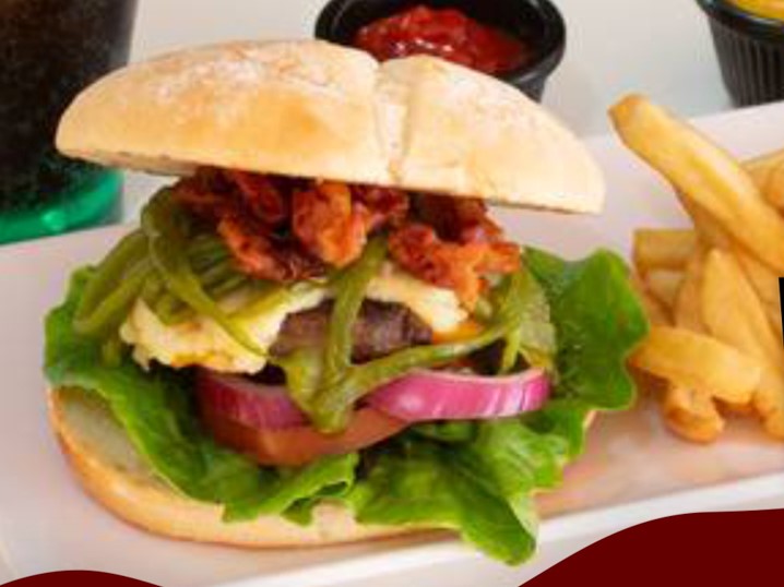 Pan artesanal con mayonesa, carne 100% sirloin, queso americano, queso gouda, chile verde rescoldado (asado), tocino, lechuga, tomate y cebolla morada... acompañada de papas a la francesa.