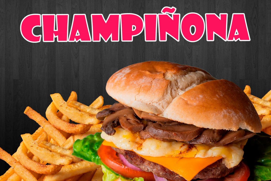 Pan artesanal con mayonesa, carne 100% sirloin, queso americano, queso gouda, champiñones, lechuga, tomate y cebolla morada... acompañada de papas a la francesa.