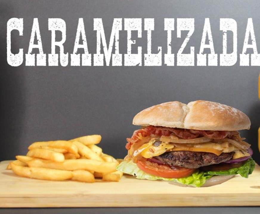 Pan artesanal con mayonesa, carne 100% sirloin, queso americano, queso gouda , cebolla caramelizada, tocino, lechuga, tomate y cebolla morada... acompañada de papas a la francesa.