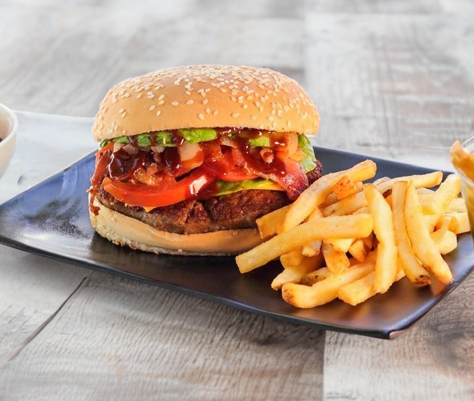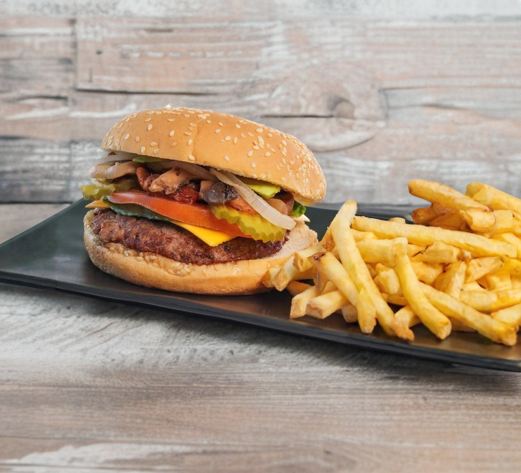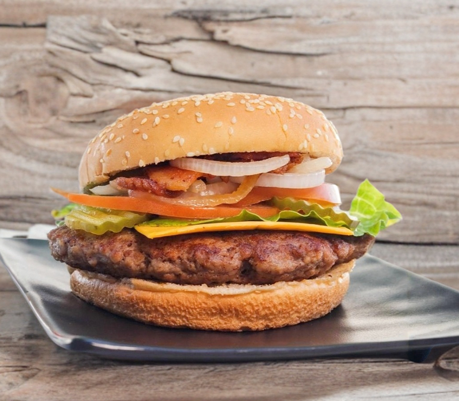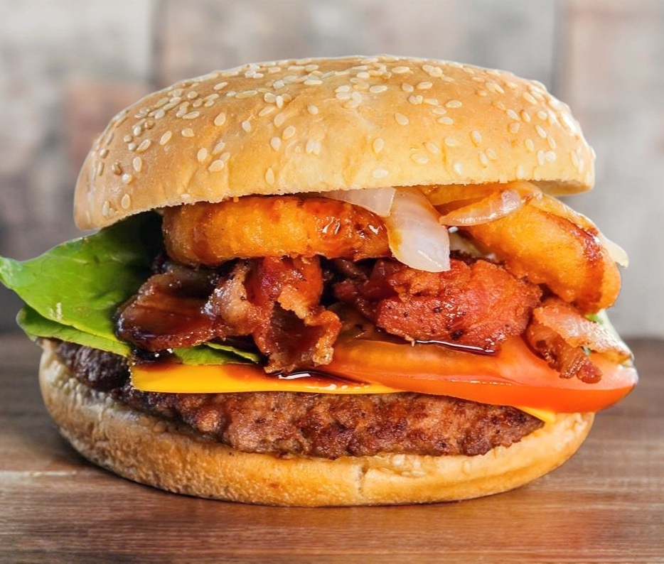 Carne, lechuga, tocino, aros, salsa BBQ, queso, tomate y cebolla guisada.