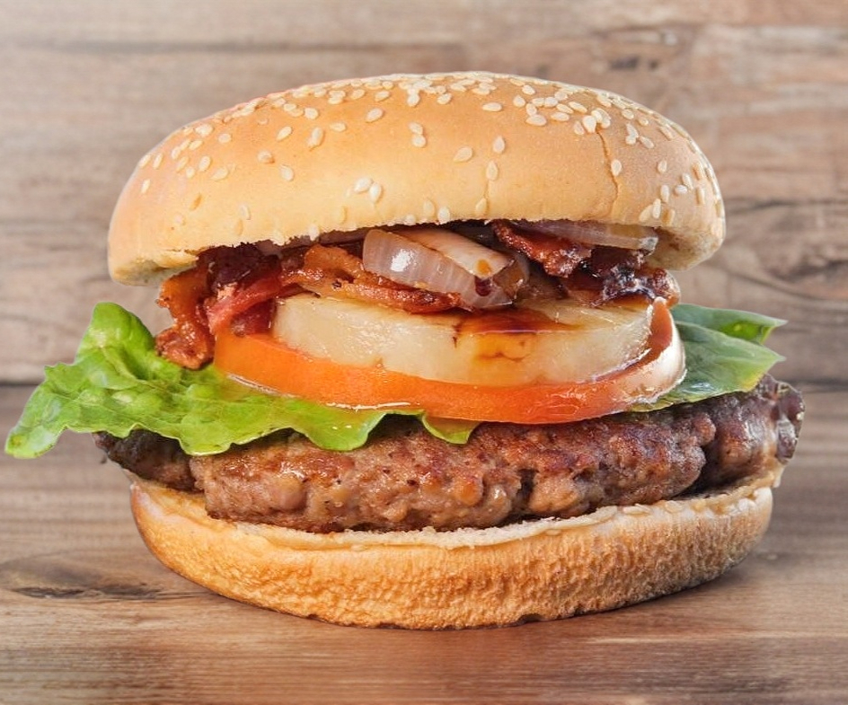 Carne, piña, salsa especial, tocino, lechuga, tomate y cebolla guisada.
