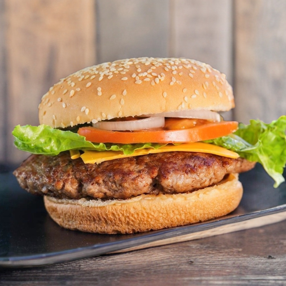 Carne, queso, lechuga, tomate, cebolla y pickle.