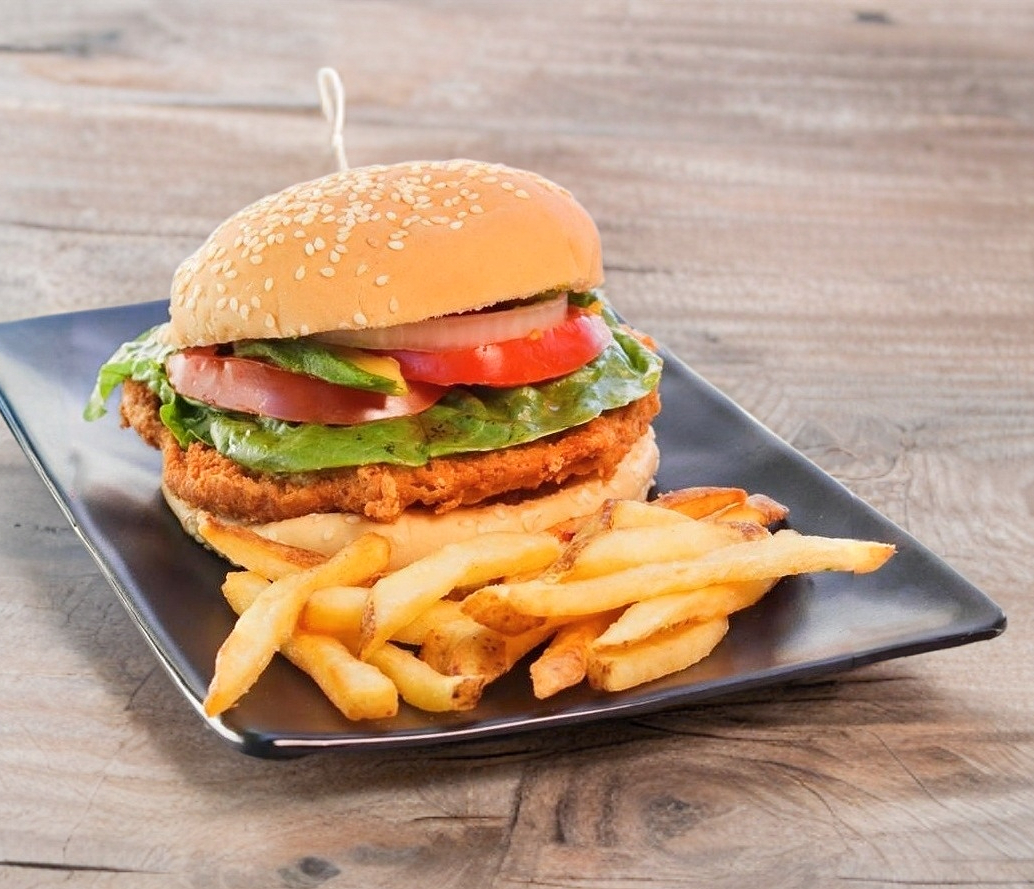 Pechuga empanizada, lechuga, tomate, cebolla y aderezo de la casa.