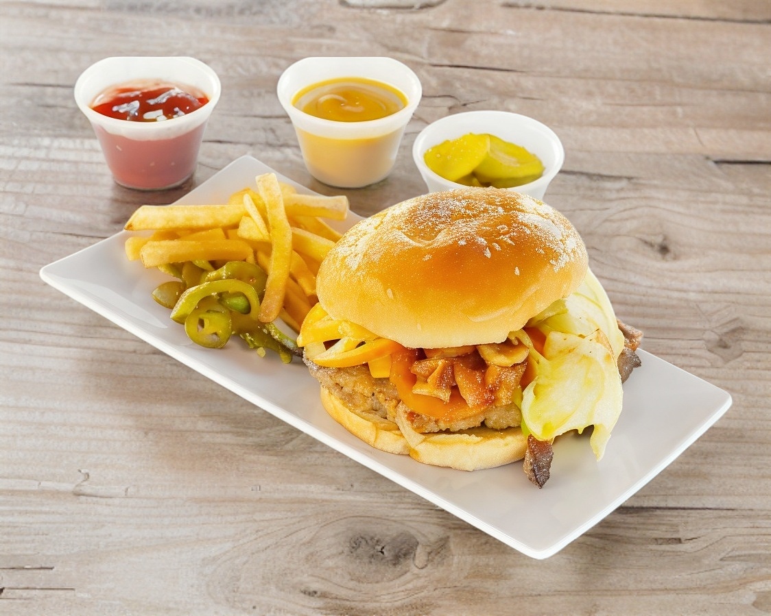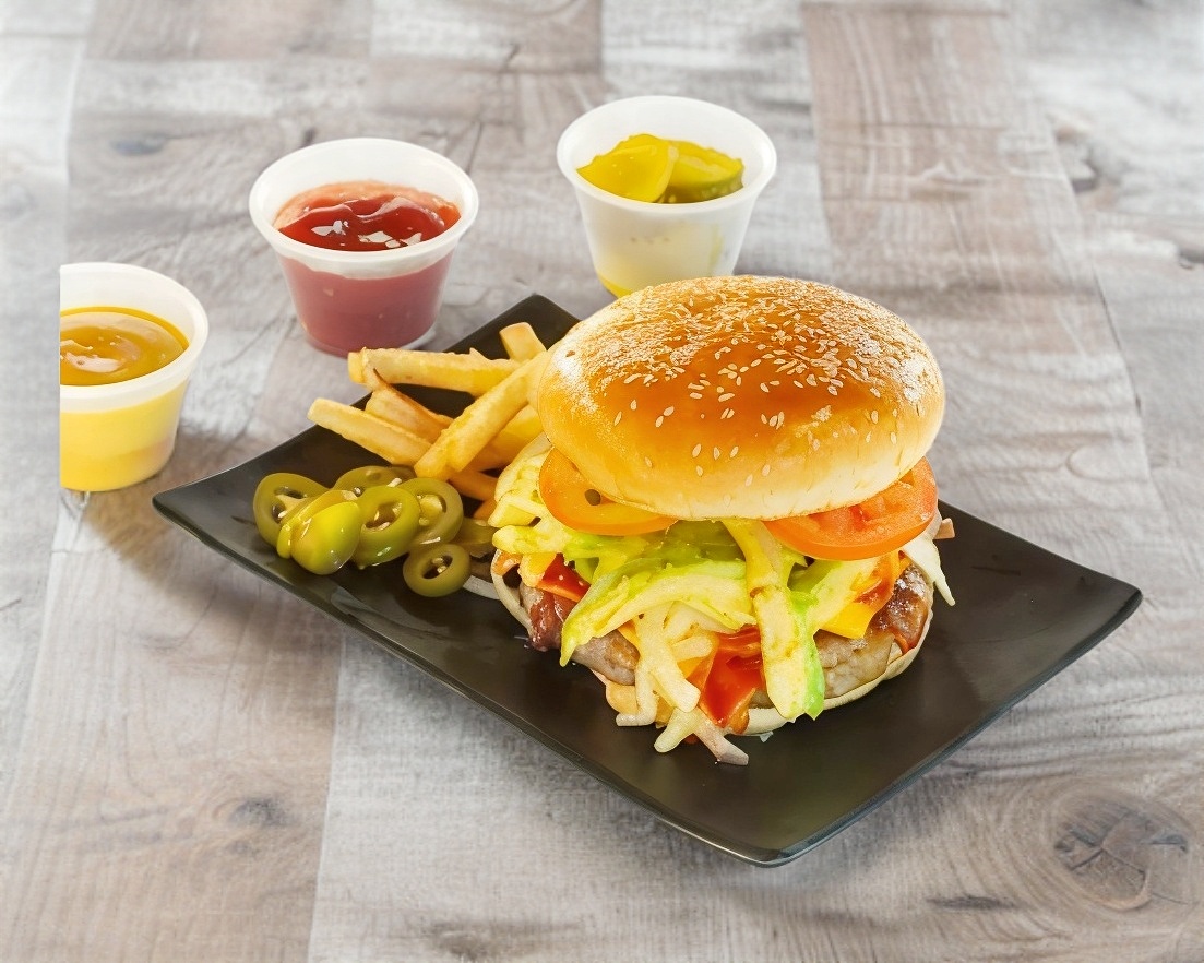 Carne, lechuga, tocino, aros, salsa BBQ, queso, tomate y cebolla guisada.
