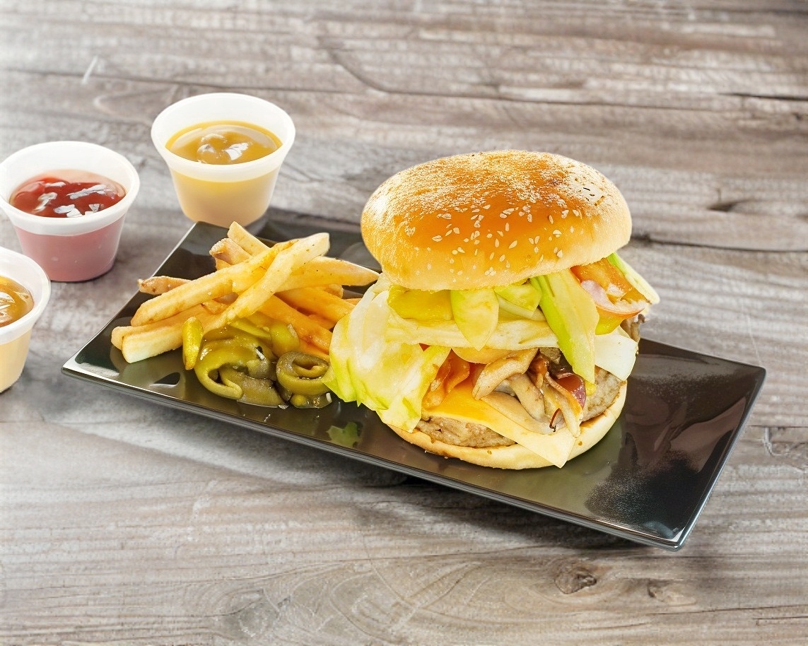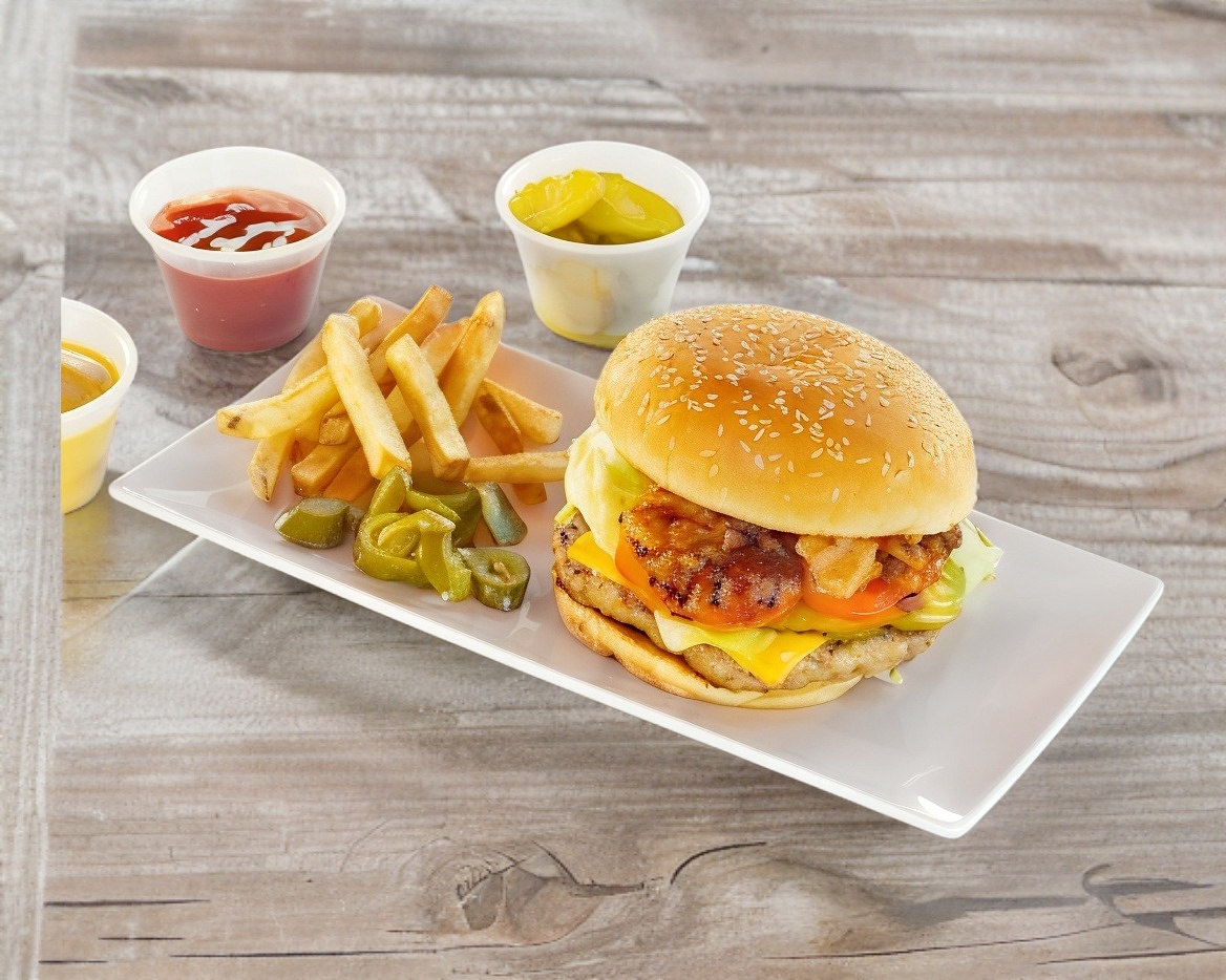 Carne, piña, salsa especial, tocino, lechuga, tomate y cebolla guisada.