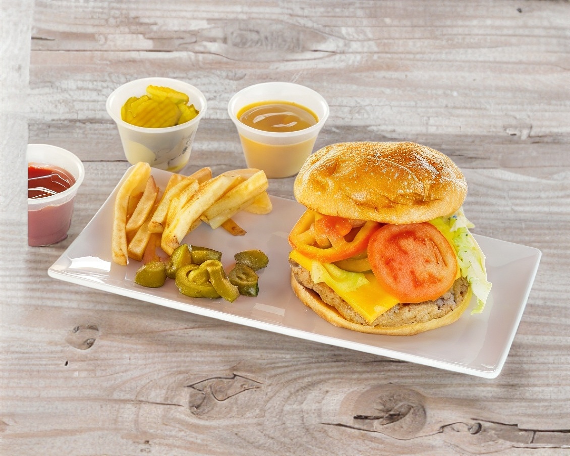 Carne, queso, lechuga, tomate, cebolla y pickle.