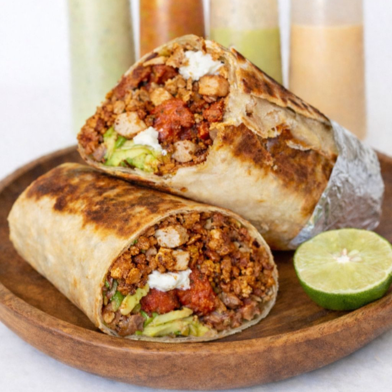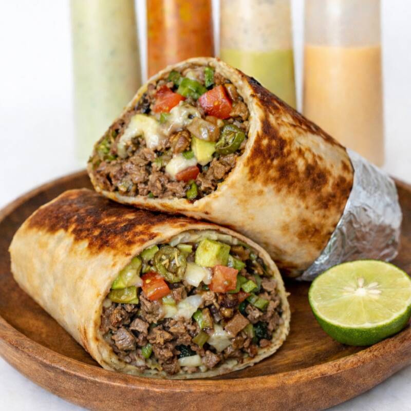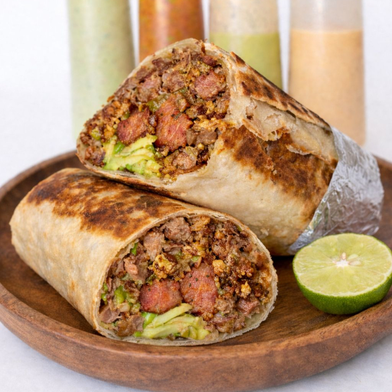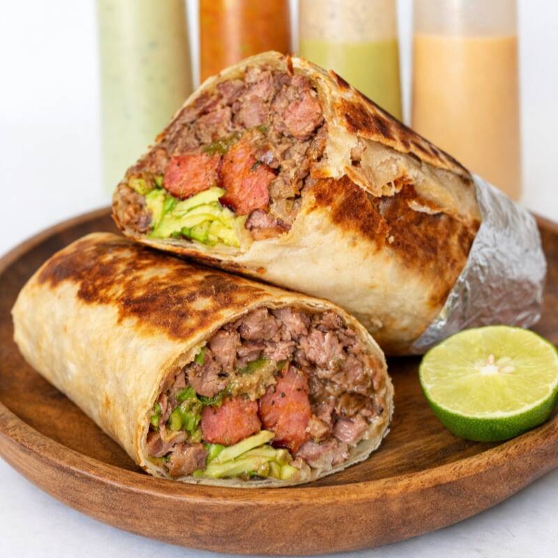 Base de Carne Adobada y Pollo Asado, Queso Crema (Philadelphia), Queso Asadero, Frijoles, Tomate, Aguacate, Cebolla Especial.