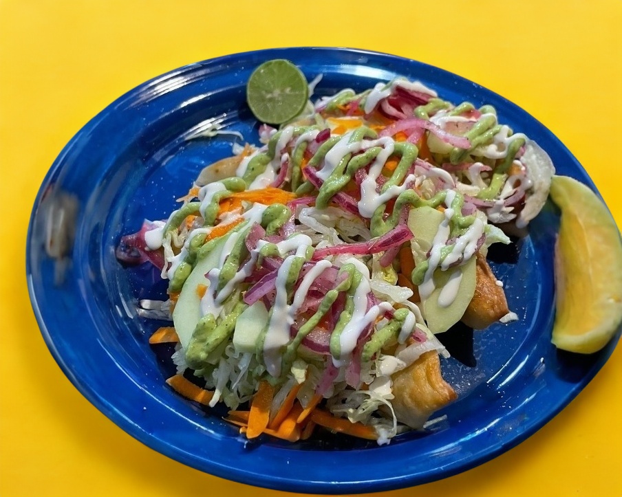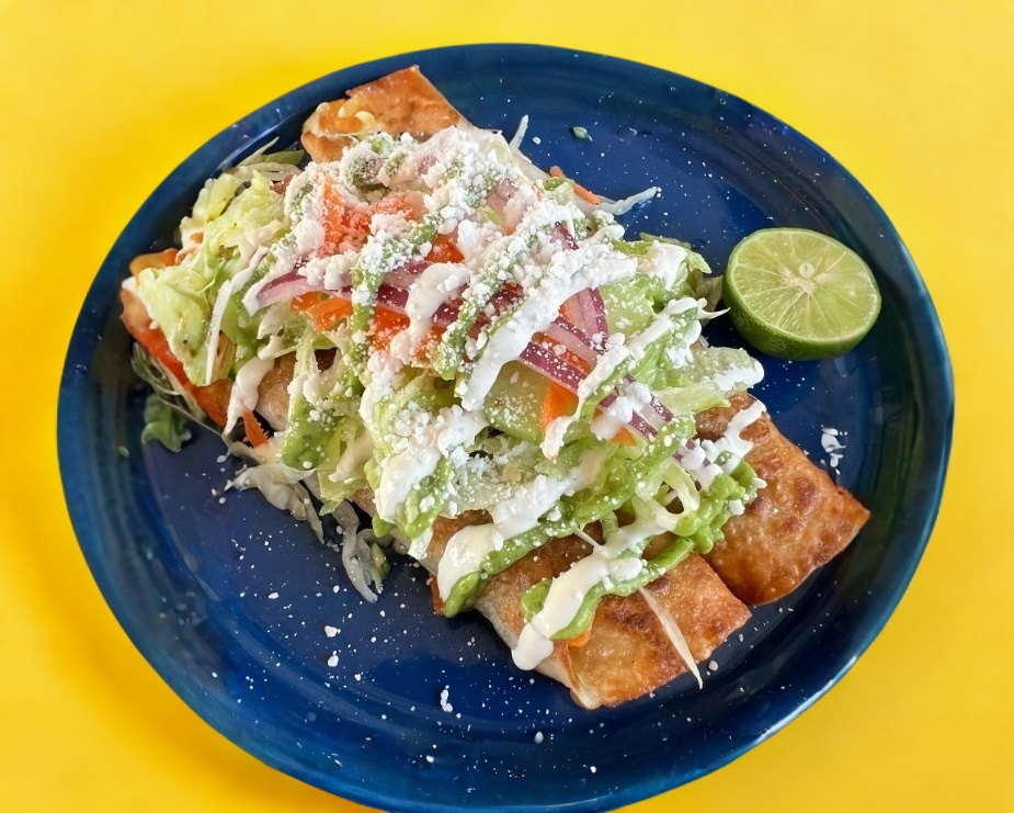 Orden de 4 tacos dorados de carne con verdura, crema y guacamole