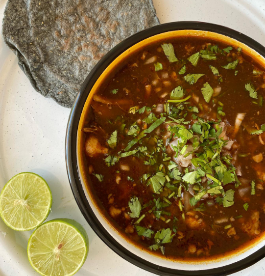 Litro de birria 100% de res, acompañado de tortillas hechas a mano y verdura