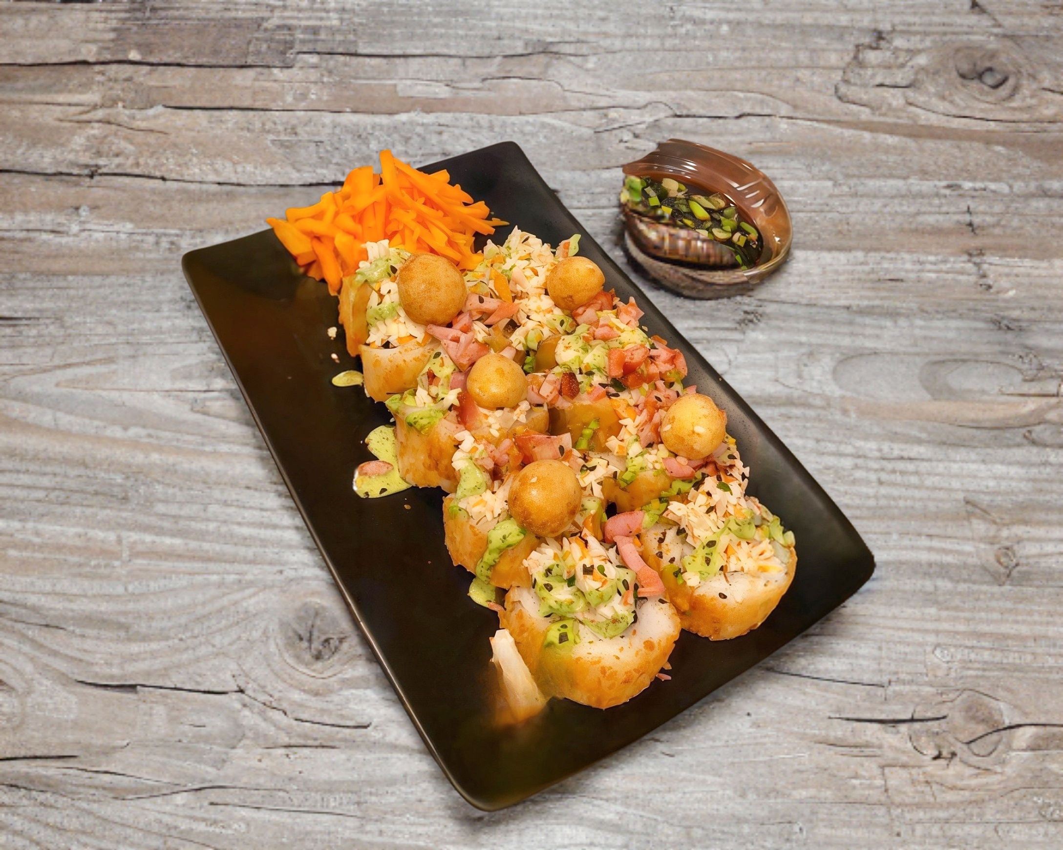 Camarón, philadelphia, pepino, aguacate, topping de Tampico, polvo spicy, tocino, bañado en aderezo de cilantro y bolitas philadelphia empanizadas