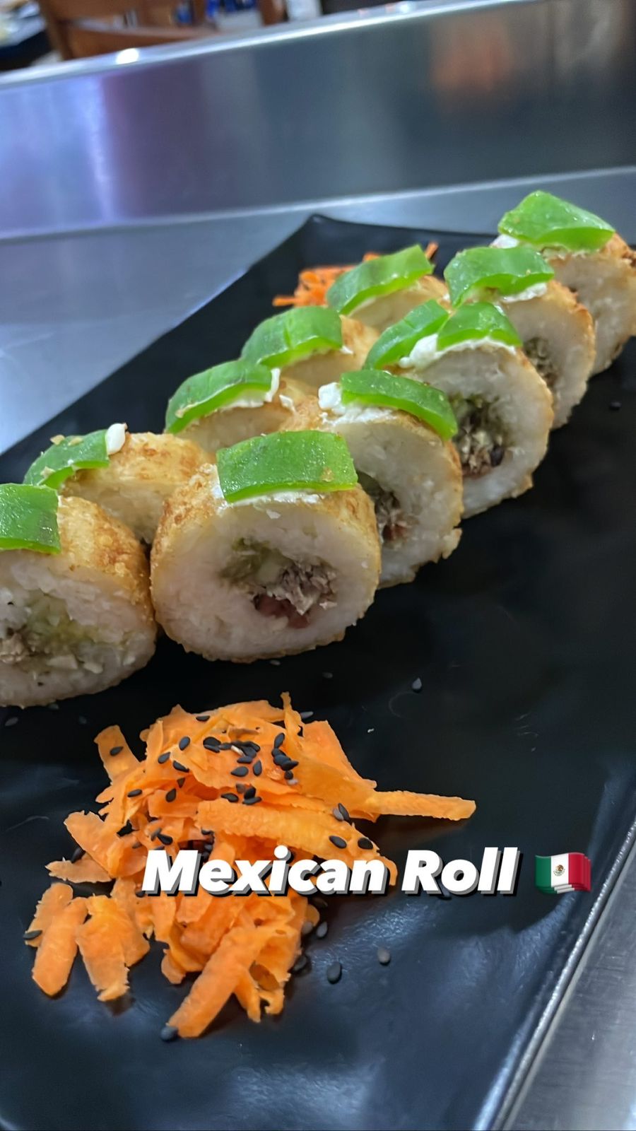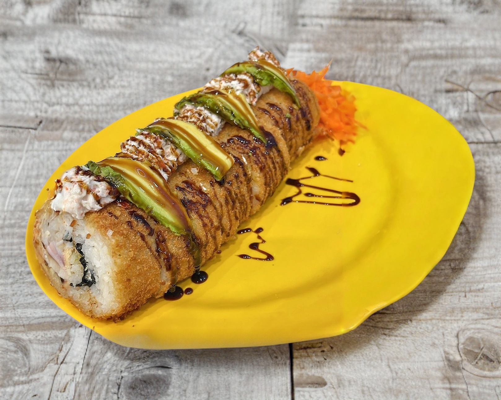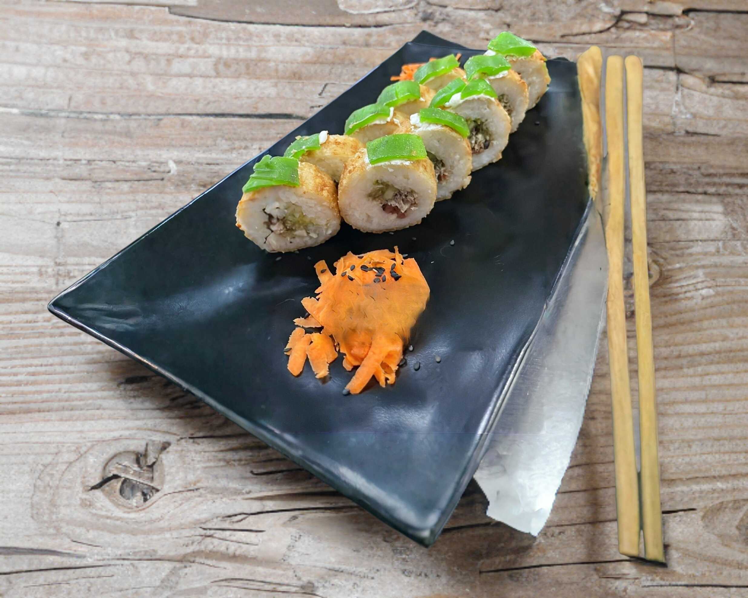 1 Rollo de sushi (10 bocados) camarón, Philadelphia, aguacate, pepino, topping de tampico y bañado en salsa de anguila.