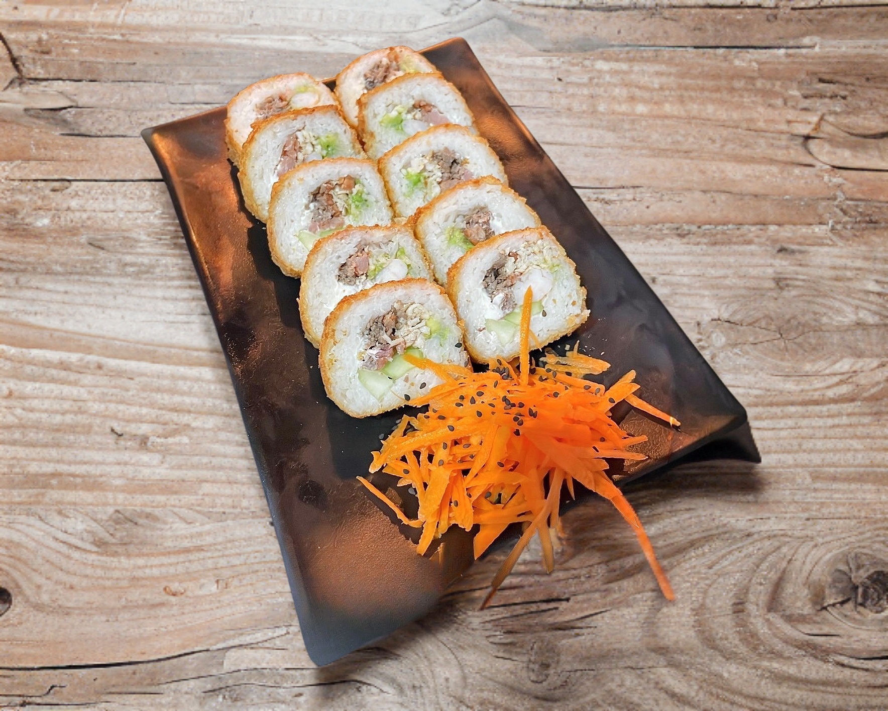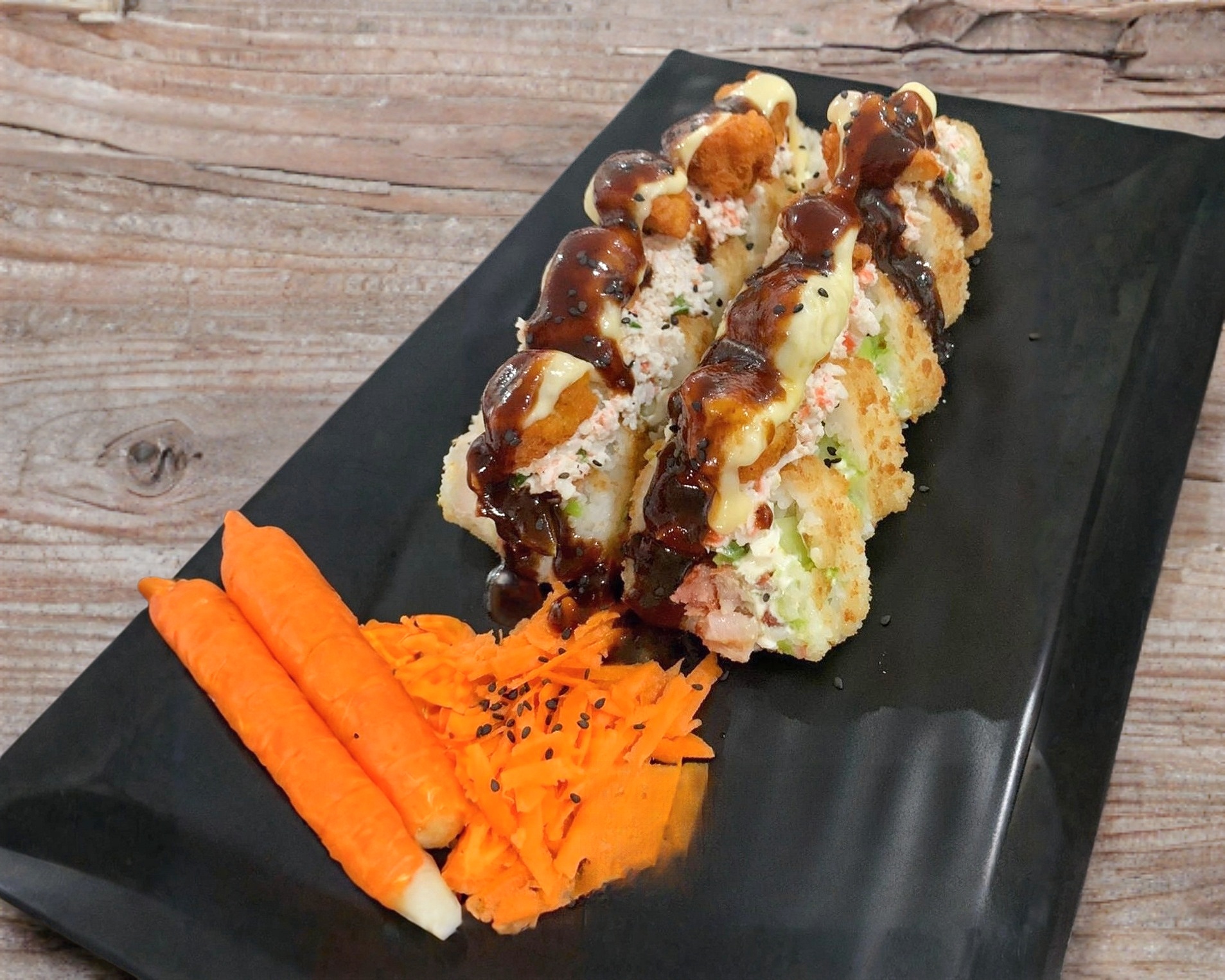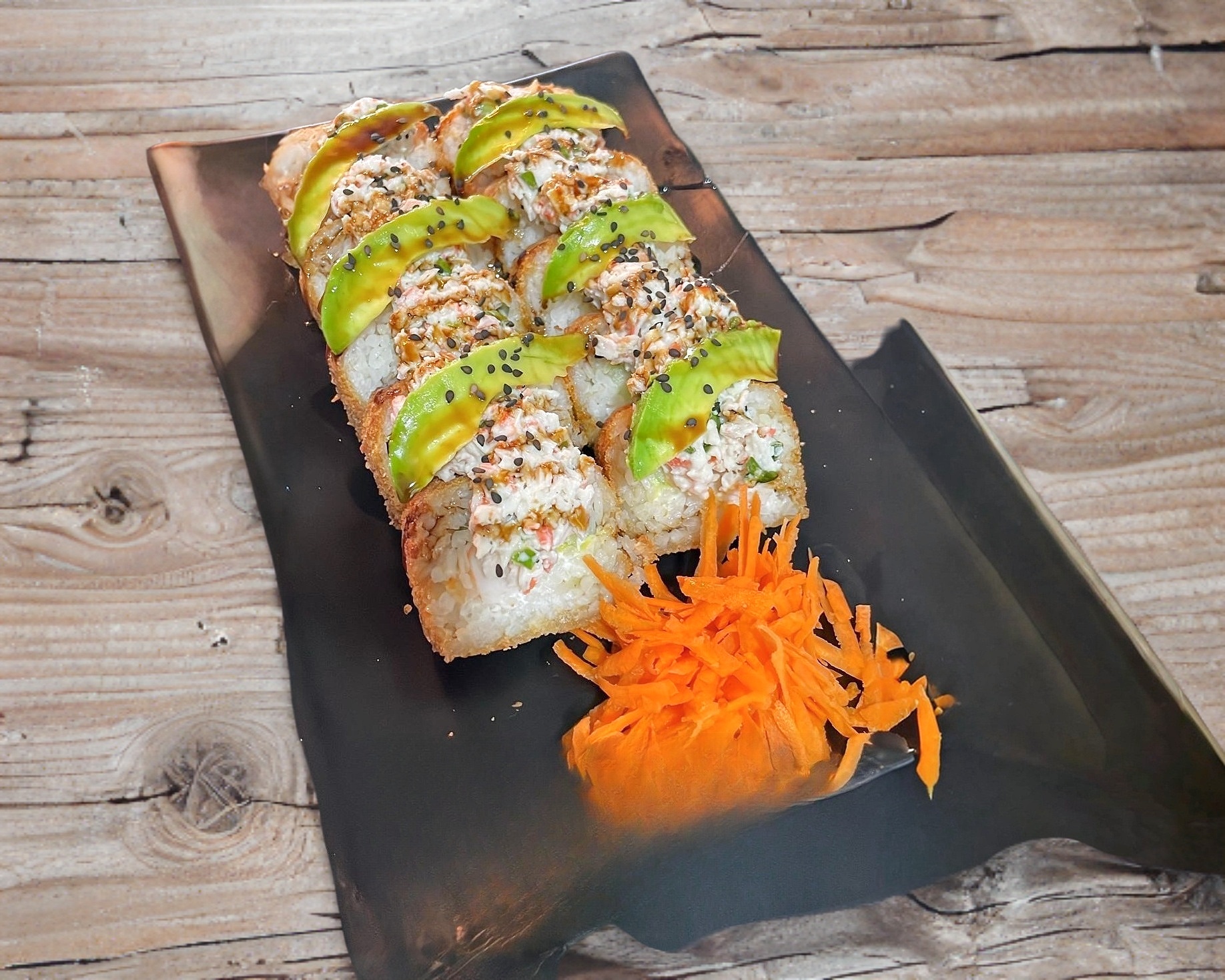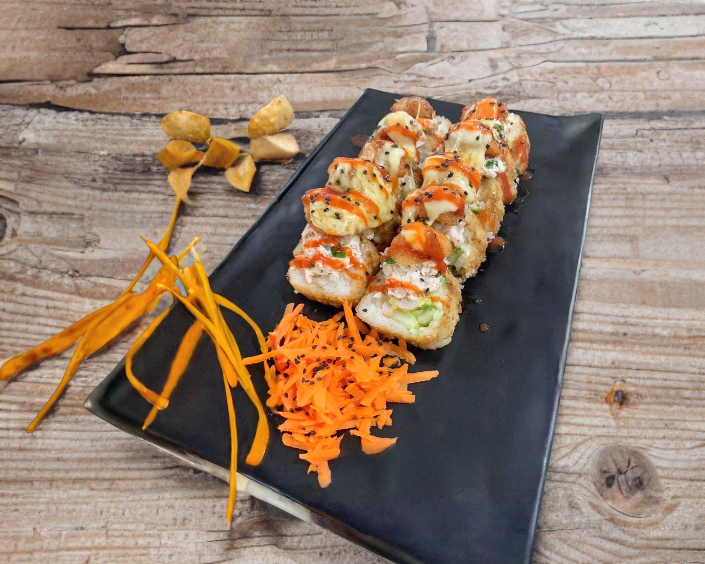Camaron. philadelphia, pepino, aguacate, topping Tampico y camarones empanizados, queso gratinado, bañados en salsa de anguila y siracha