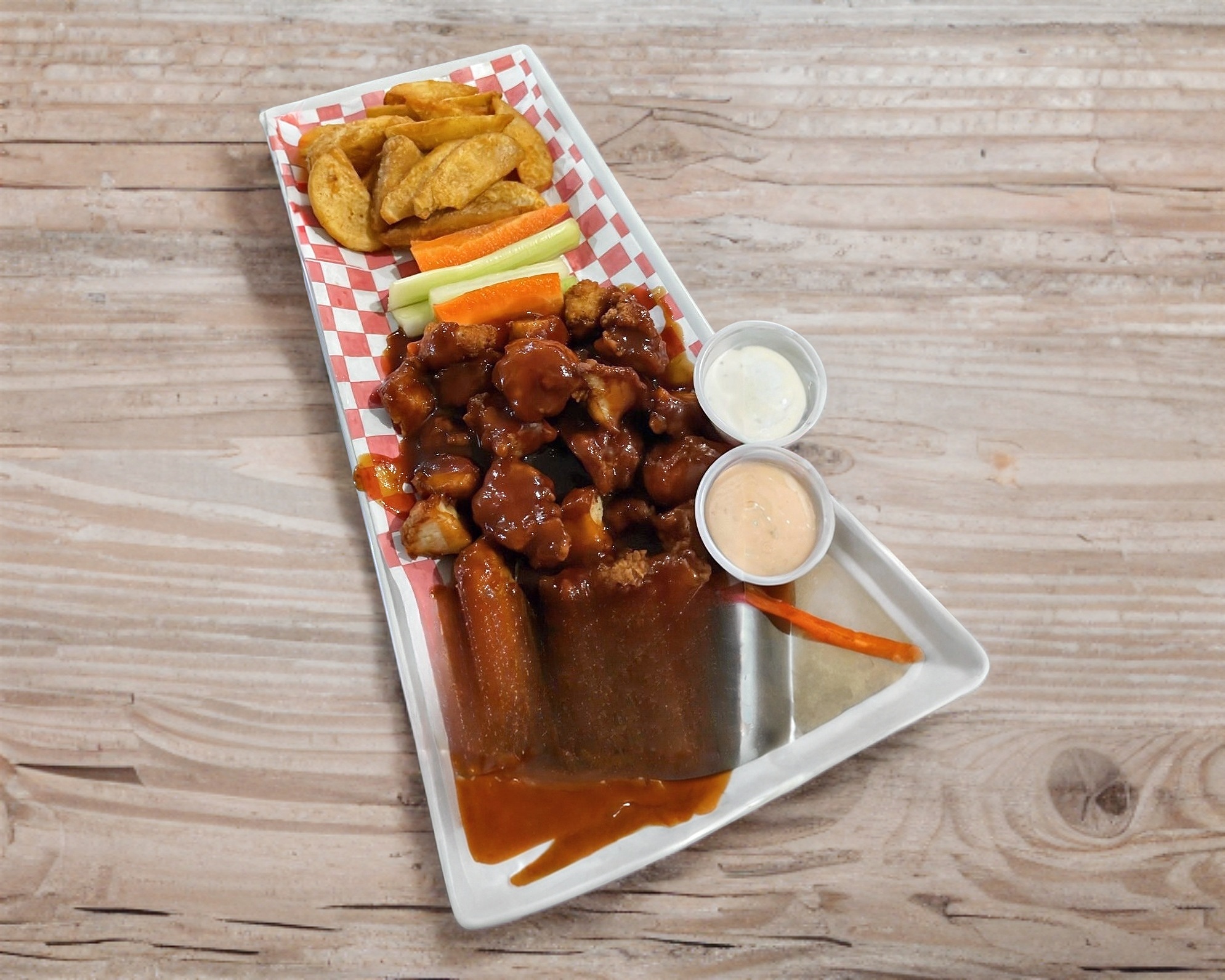 300 grs. de pechuga de pollo empanizado bañado en salsa de su elección, acompañado de baritas de apio y zanahoria y aderezo ranch
