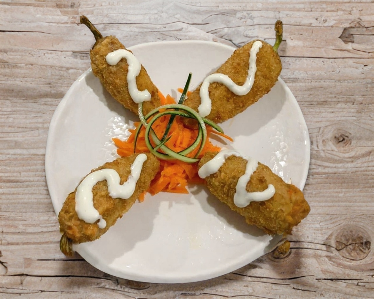 4 chiles caribes rellenos de filadelfia empanizados con aderezo ranch