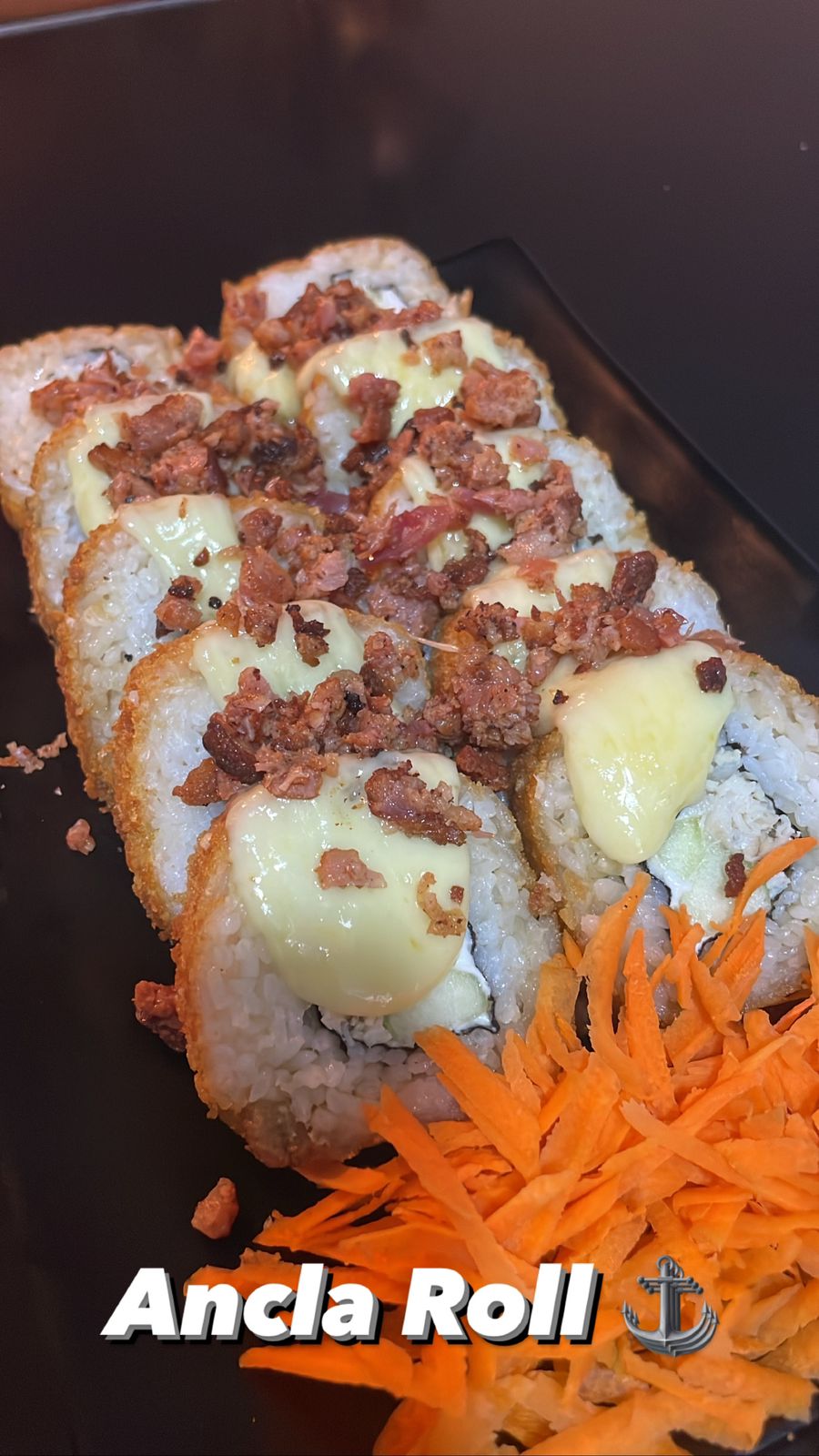 Camarón, Tocino, philadelphia, pepino, aguacate, forrado de queso gratinado, bañado en aderezo chipotle y anguila. (horneado)