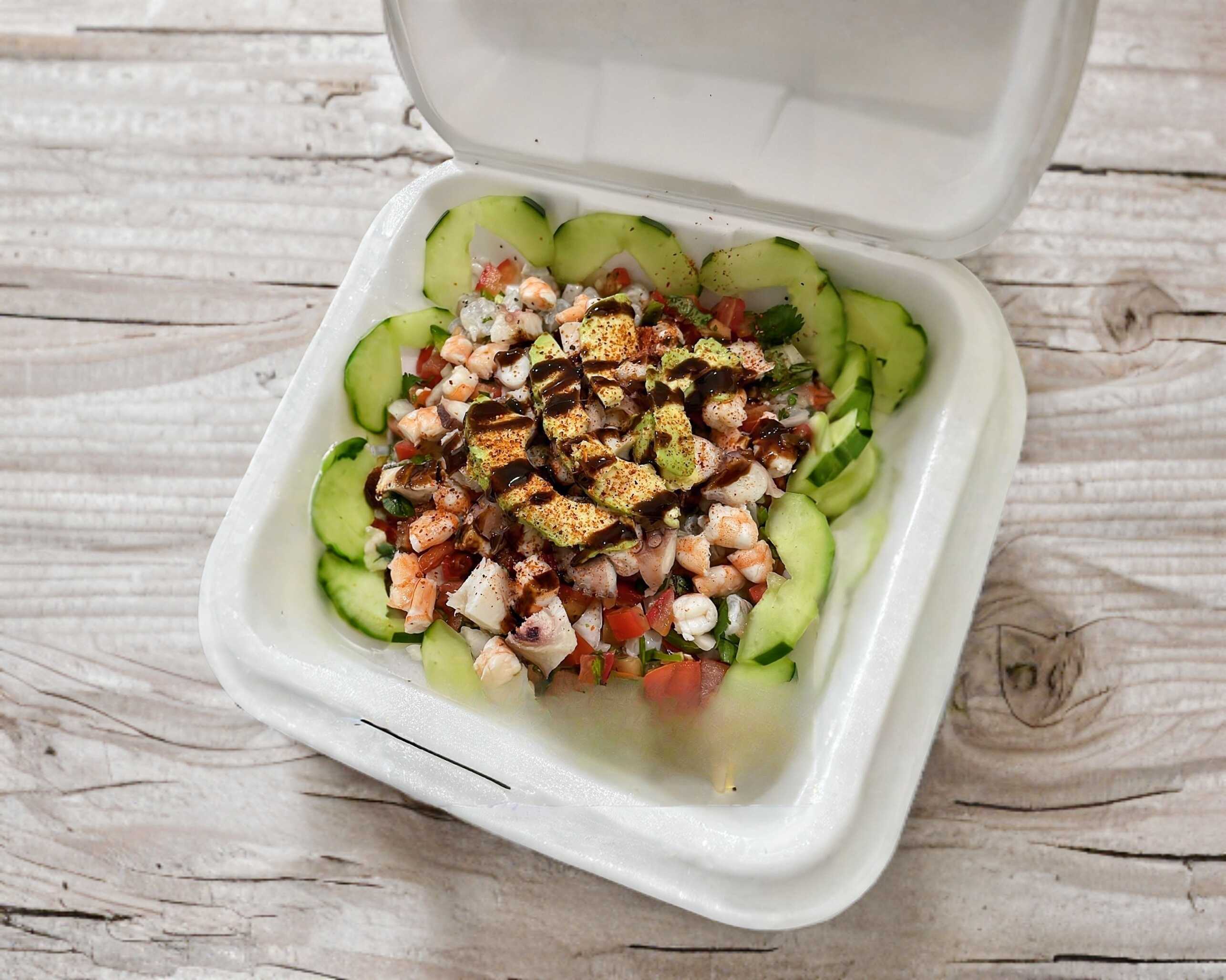 Camarón crudo, cocido, pulpo y atún, con verduras; chile, tomate, cebolla, cilantro, aguacate y salseado de la casa.