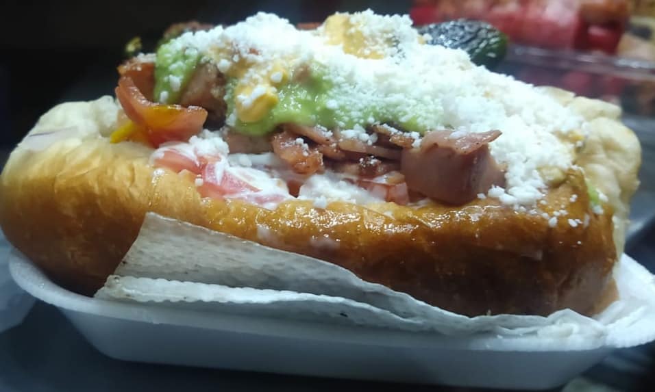 Dogo con salchicha para asar con otra salchicha dentro rellena de queso envuelta con tocino
