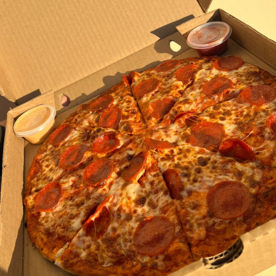 Clásica pizza de masa artesanal cubierta con generosas rebanadas de pepperoni y queso fundido.