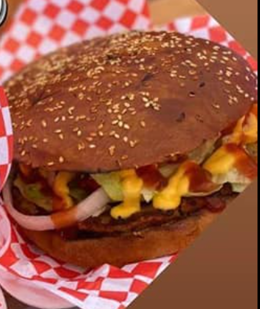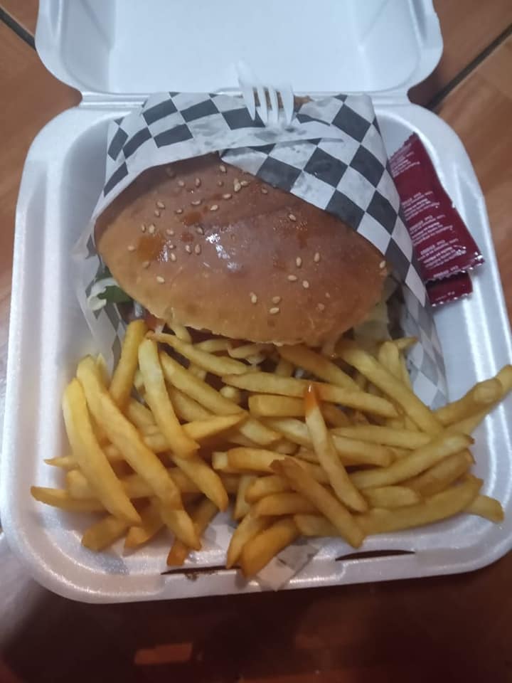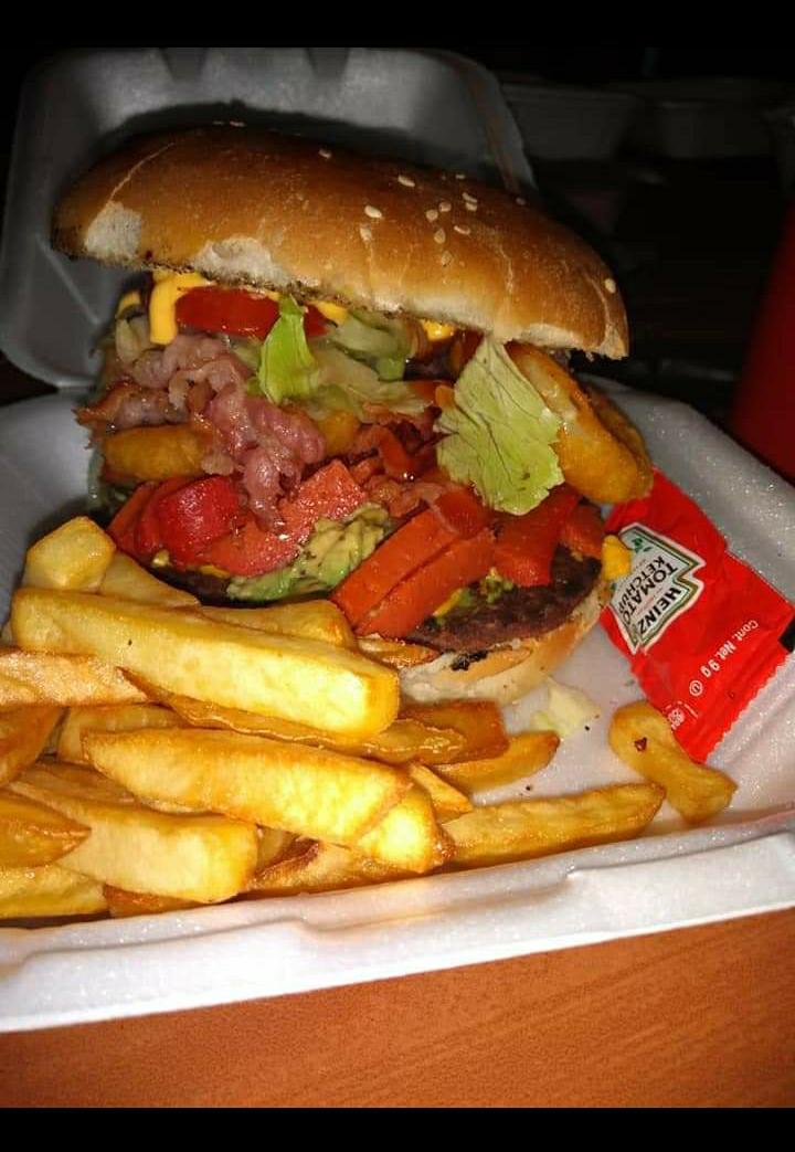 150gr. Carne de res,queso amarillo,doble porción de tocino,aguacate, lechuga,tomate, cebolla,chiles y pepinillos con papas