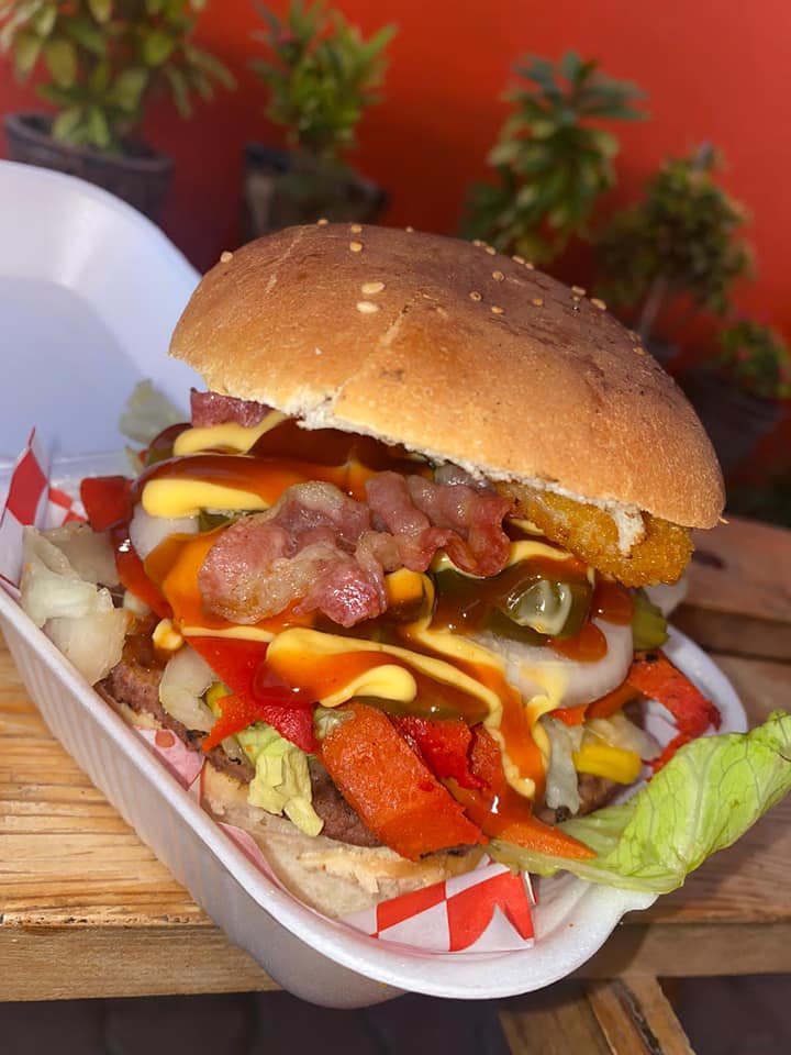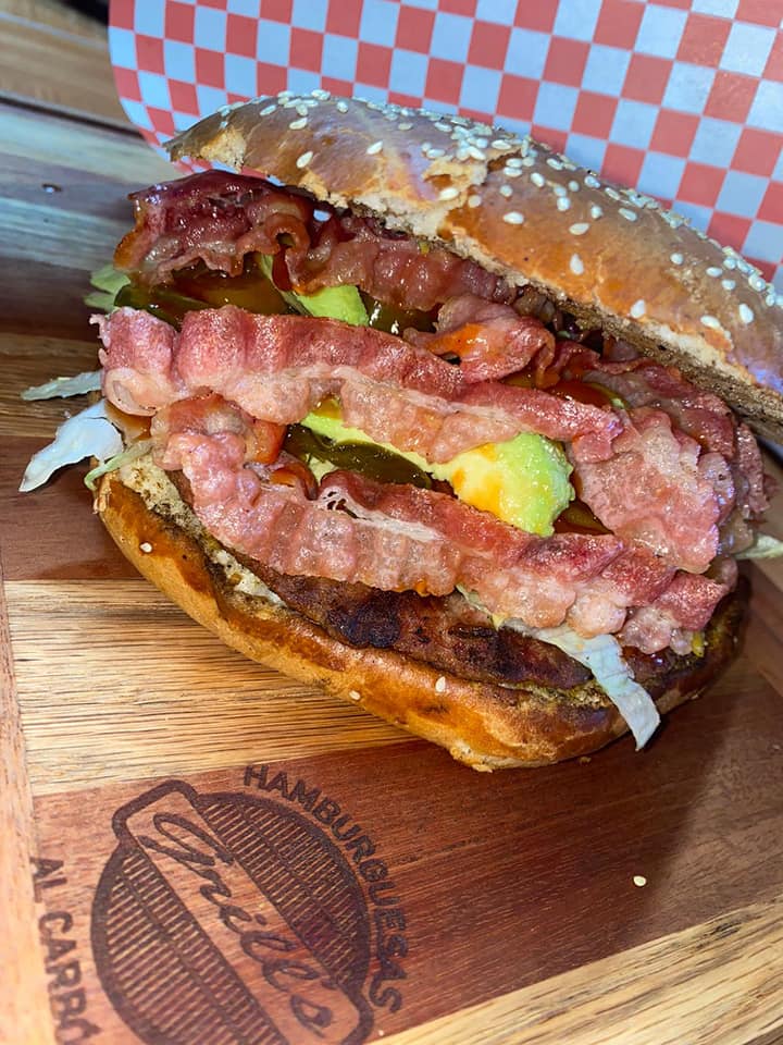 2 carnes 300g, queso, tocino, aguacate, lechuga, tomate, cebolla, pepinillos y chiles