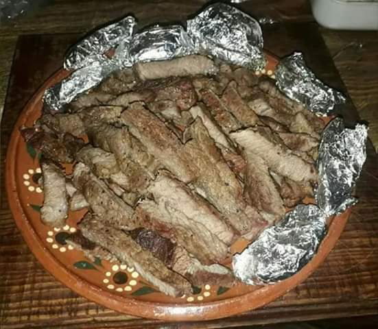 Acompañada de tortillas de maíz,salsa y cebollas asadas
