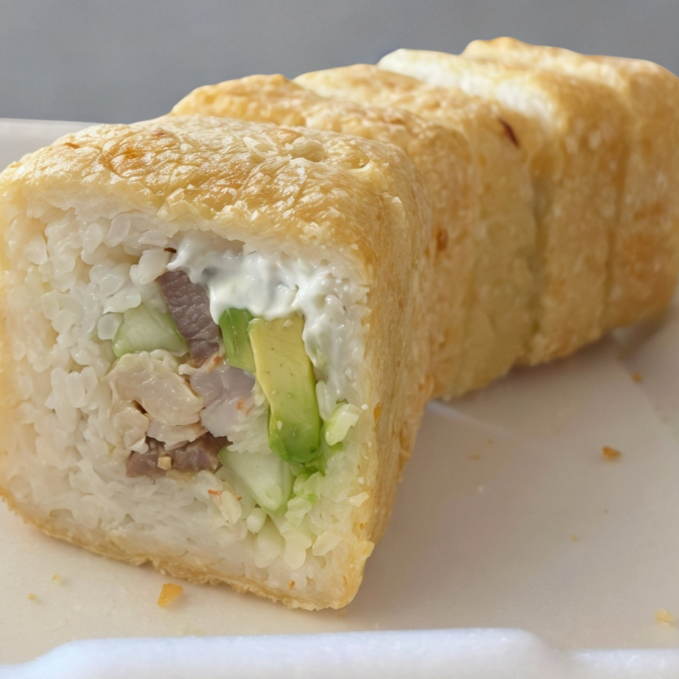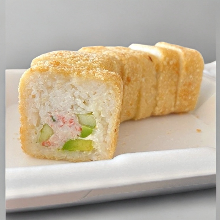 Phila, surimi y pepino por dentro con trozos de surimi empanizados arriba.