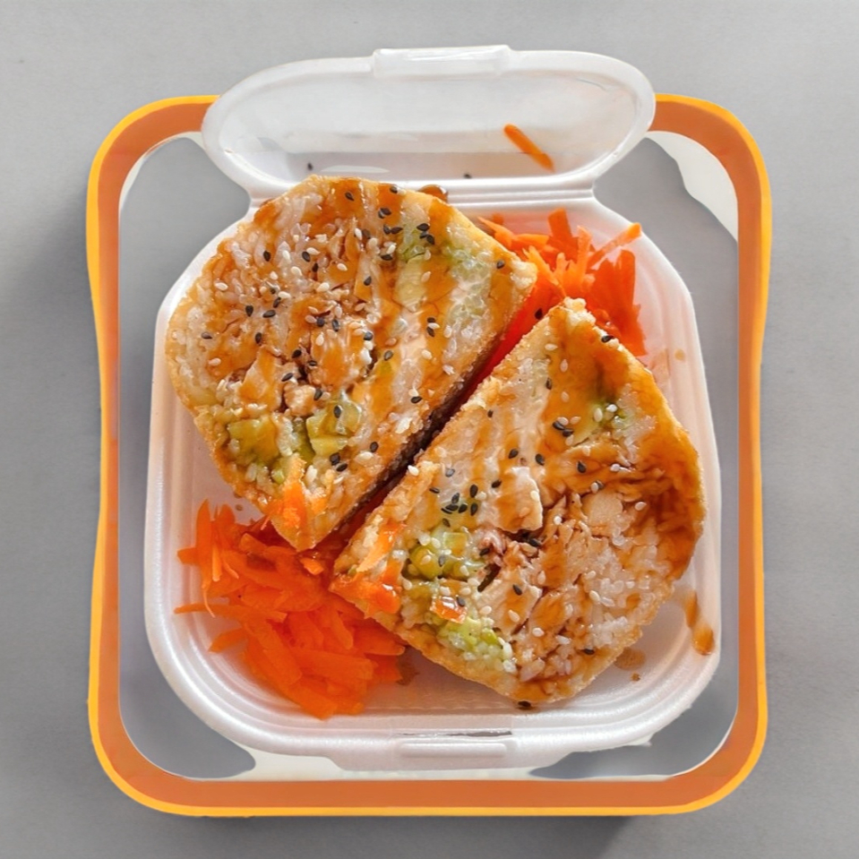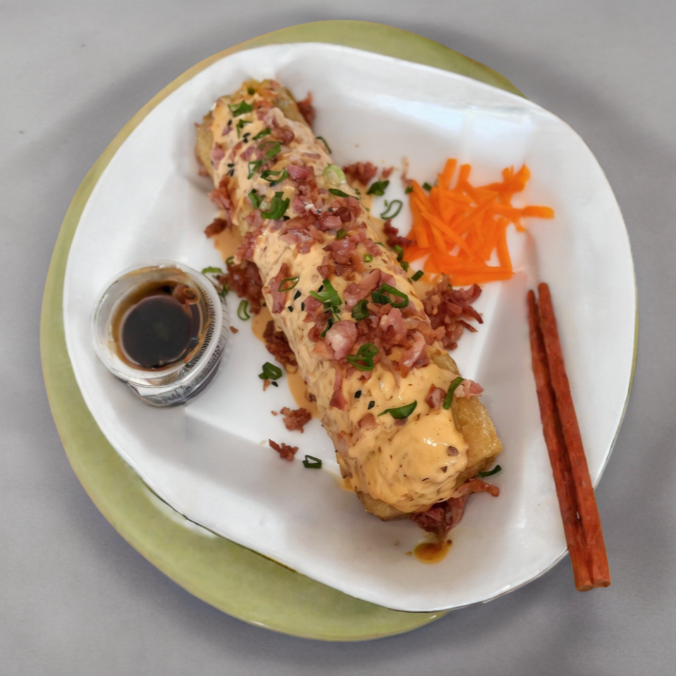 Phila, aguacate, pepino, tocino por dentro, por arriba tocino y salsa de la casa yami (10 Bocados)