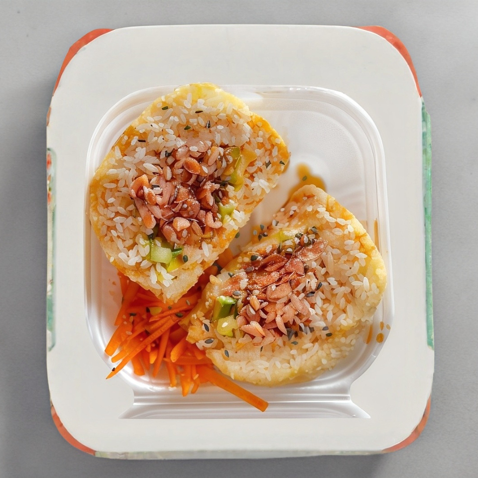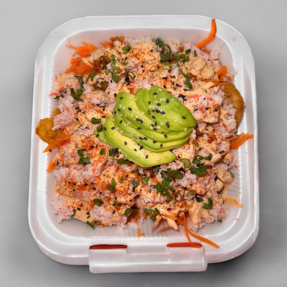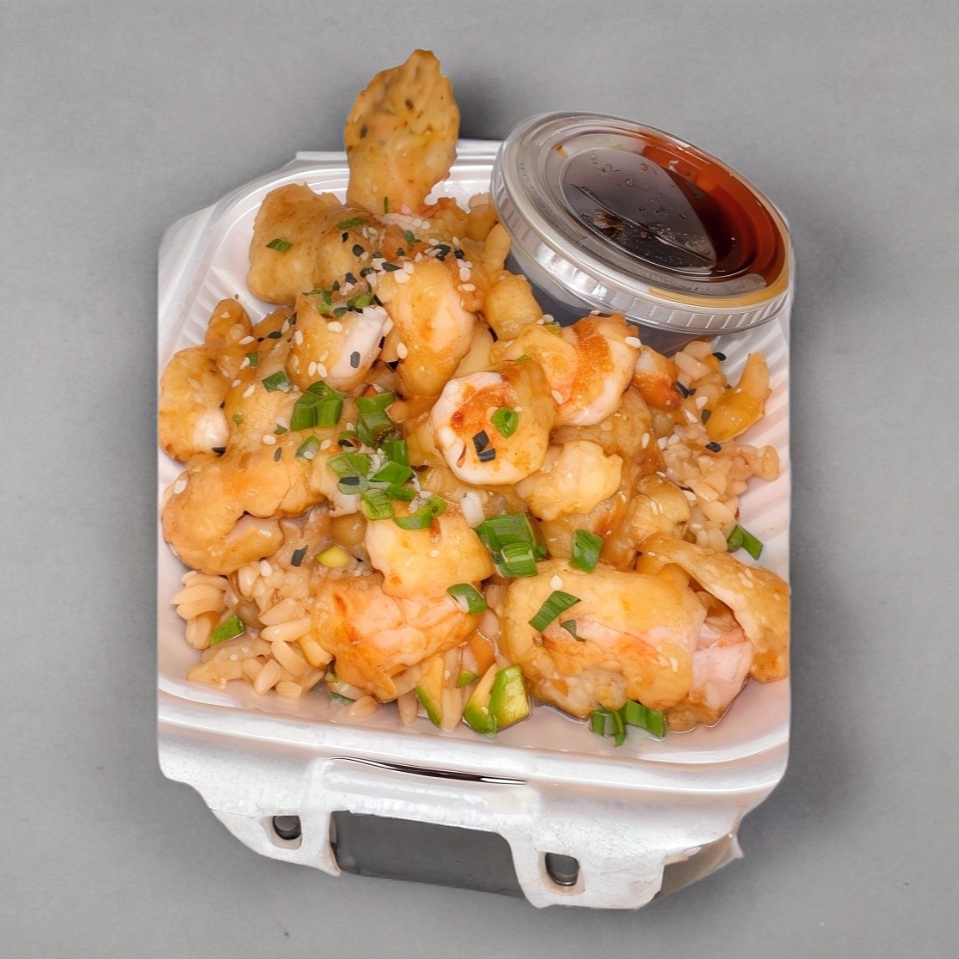 Arroz frito con zanahoria y calabaza picada en cuadritos con Res, Pollo y Camarón.