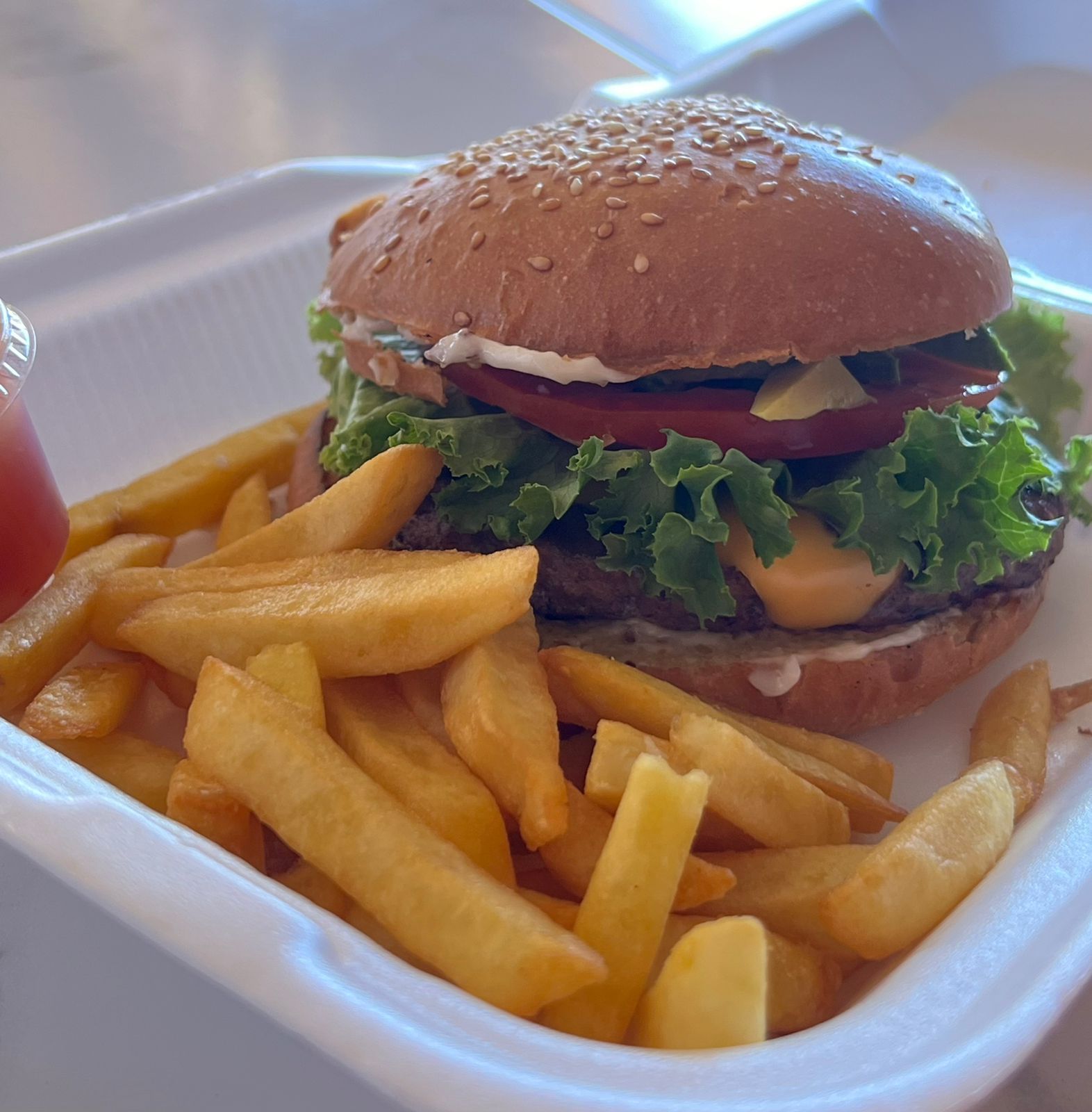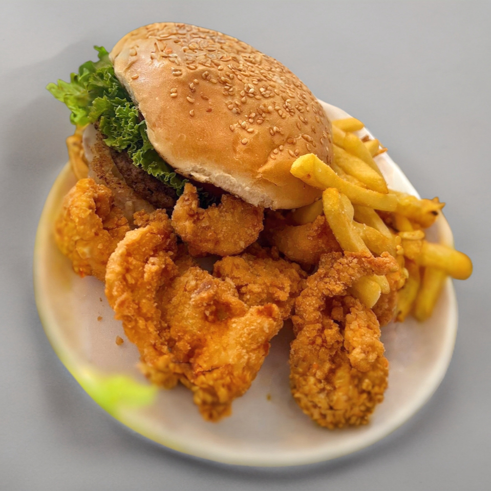 Phila, agaucate, res, pollo, tocino y camarón por dentro.