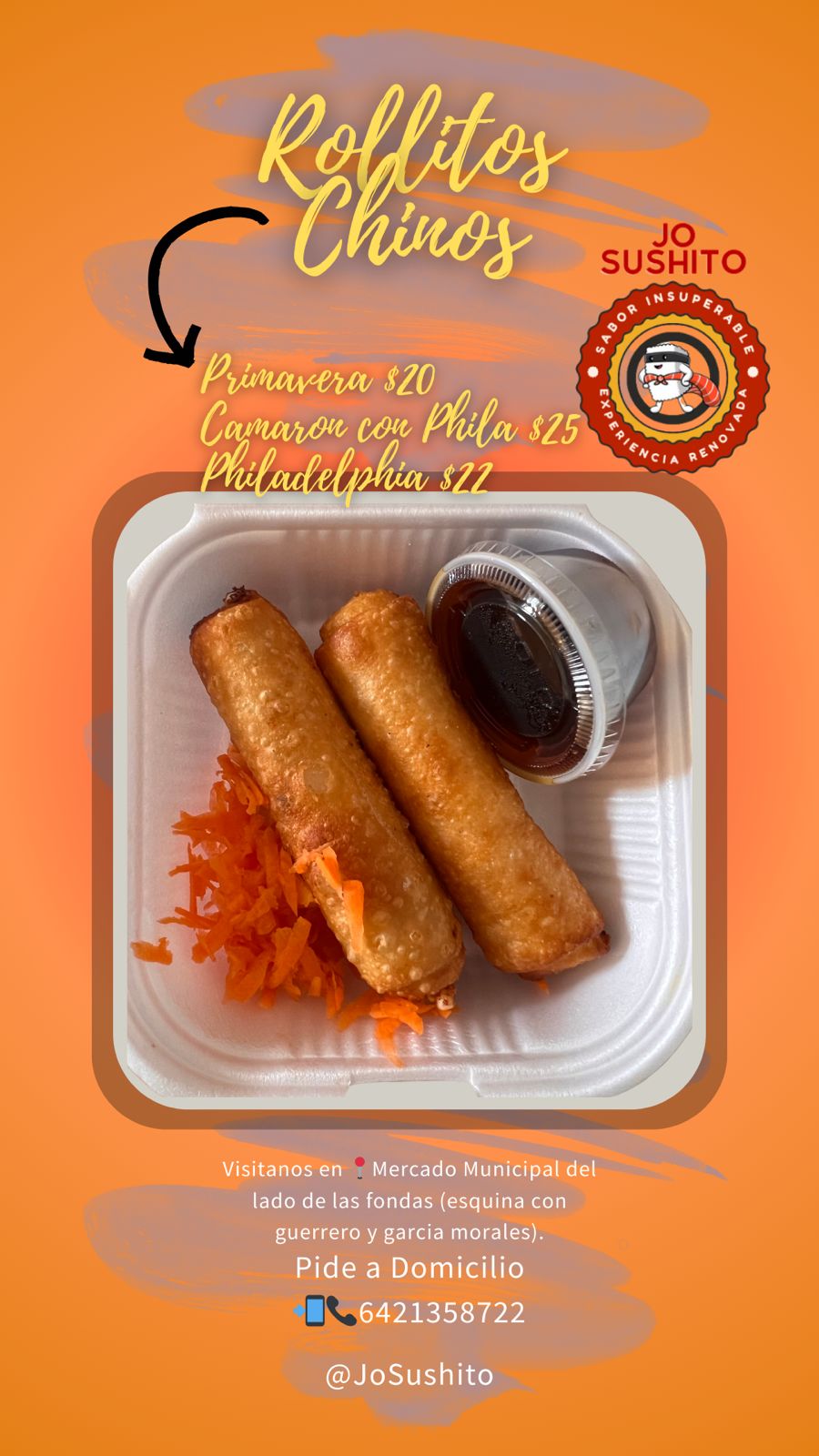 Phila, pepino, aguacate, camarón, res y pollo por dentro.