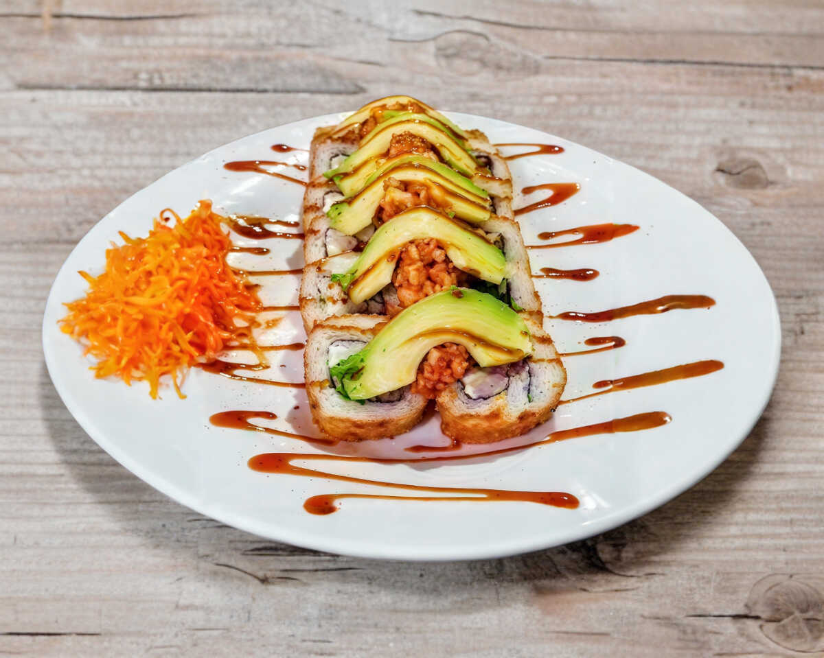 CRISPY CHICKEN, TOCINO, FILADELPHIA, AGUACATE Y PEPIINO POR FUERA: QUESO CHIHUAHUA, CHILE RESCOLDADO, CARNE ASADA Y CEBOLLA CARAMELIZADA.