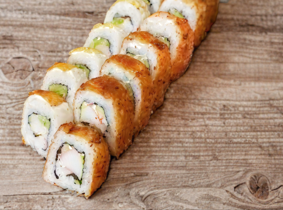 CARNE ASADA, POLLO Y TOCINO, FILADELPHIA, AGUACATE Y PEPINO POR FUERA: QUESO GRATINADO Y QUESO AMERICANO