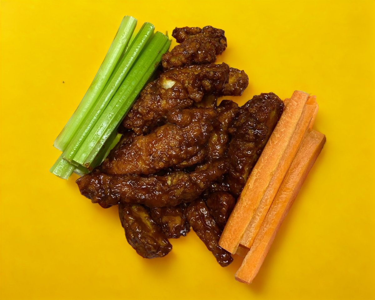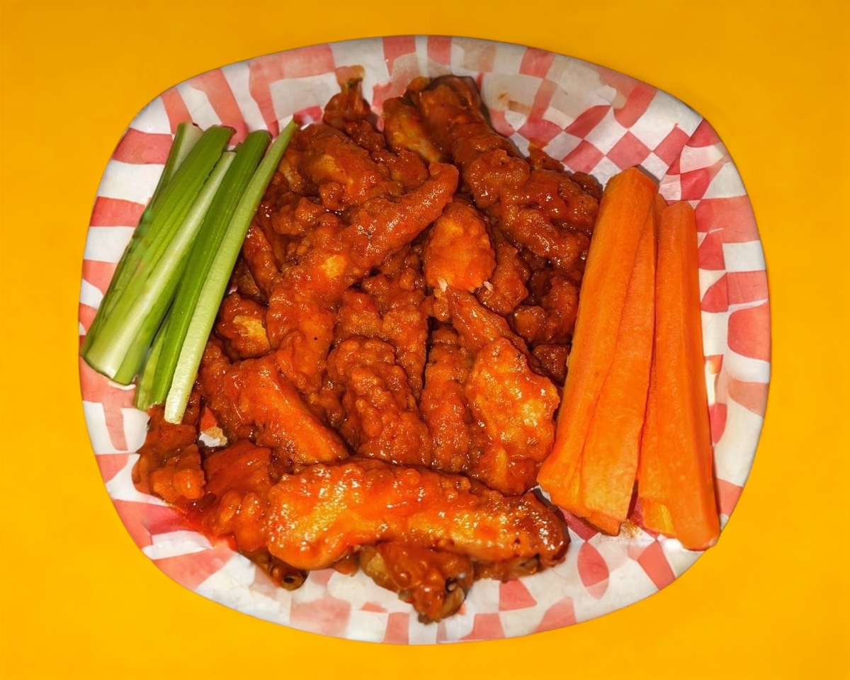 Tiras de pollo, apio, zanahoria y aderezo ranch.
