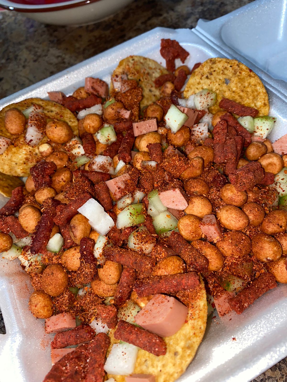 Tostitos, cacahuate, rielito, pepino, salchicha, jícama, clamato y salsas.