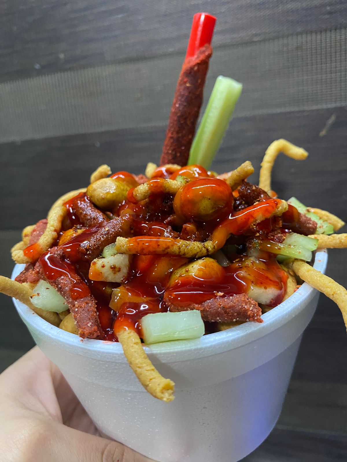 Churros, cacahuates, rielito, jícama, pepino, tarugo, salsas y clamato.