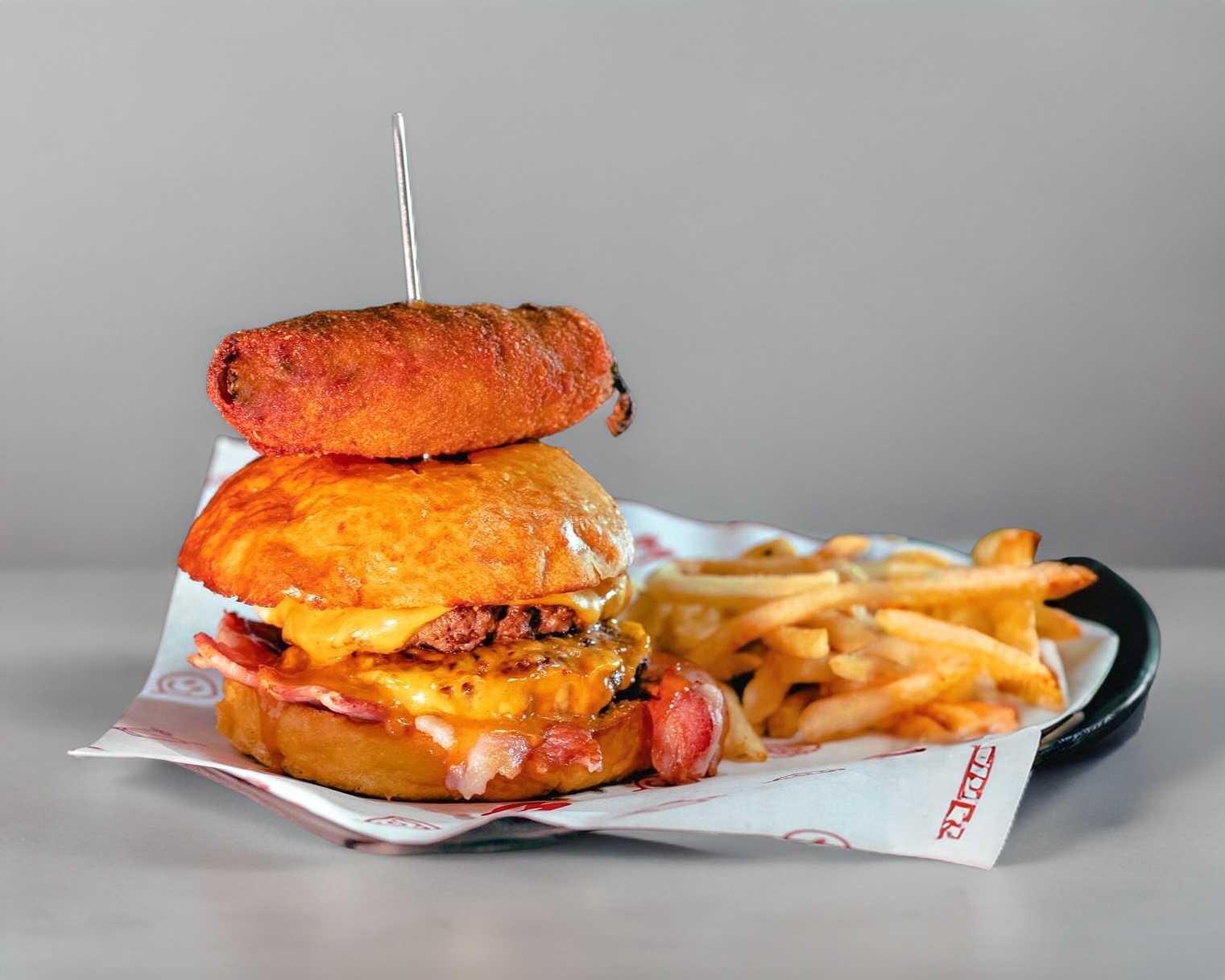 Pan brioche, 2 porciones de 100 gramos de sirloin, lava BBQ, tocino, magma mayo especial de la casa y jalapeño popper, acompañada de papas a la francesa.(Aprox. 20 gr )