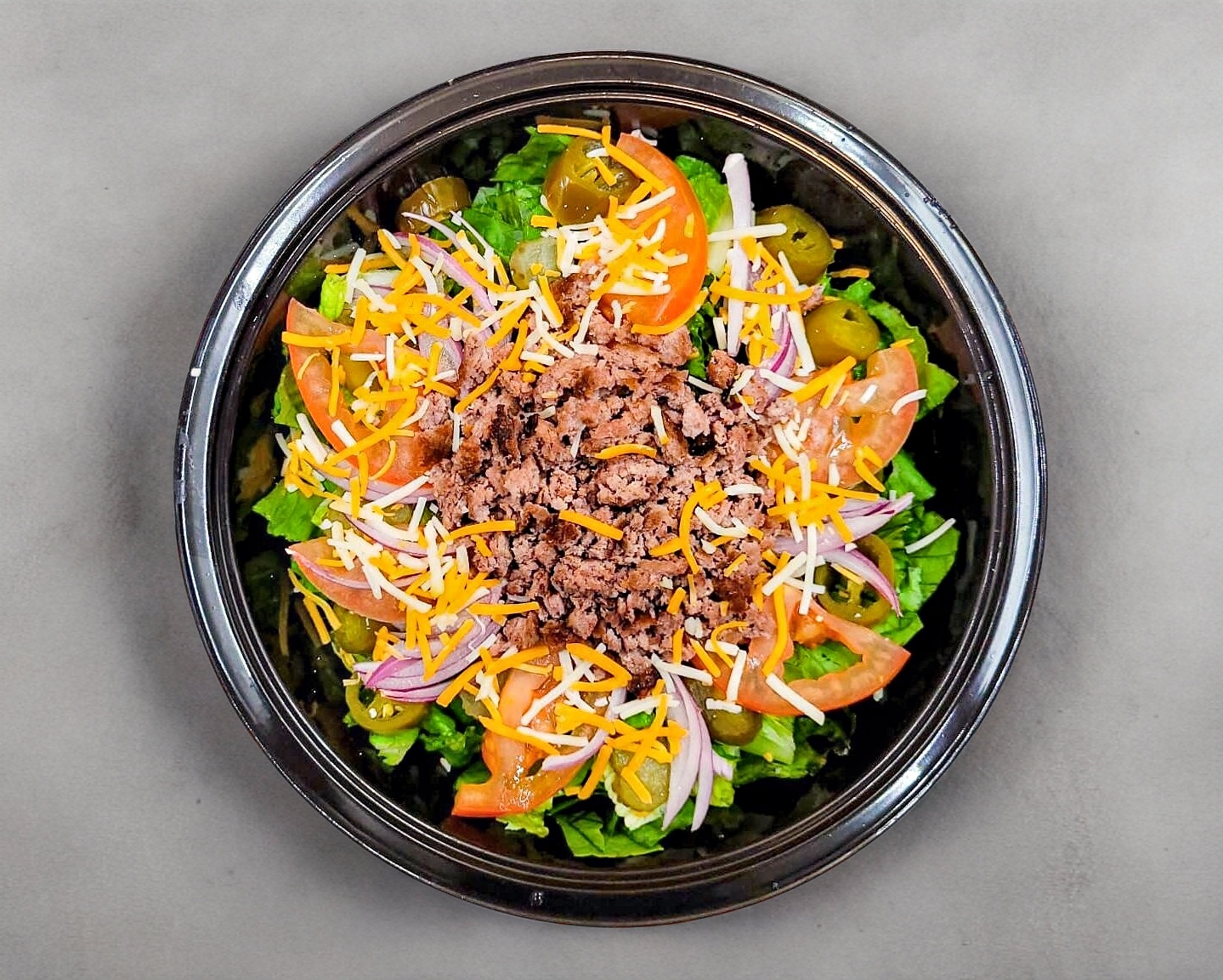 Imagina tu Burguer Favorita echa ensalada. Base de Lechuga, Carne triple molido Sirloin, pepinillos, jalapeño, tomate, mix de queso chedar y cebolla morada.