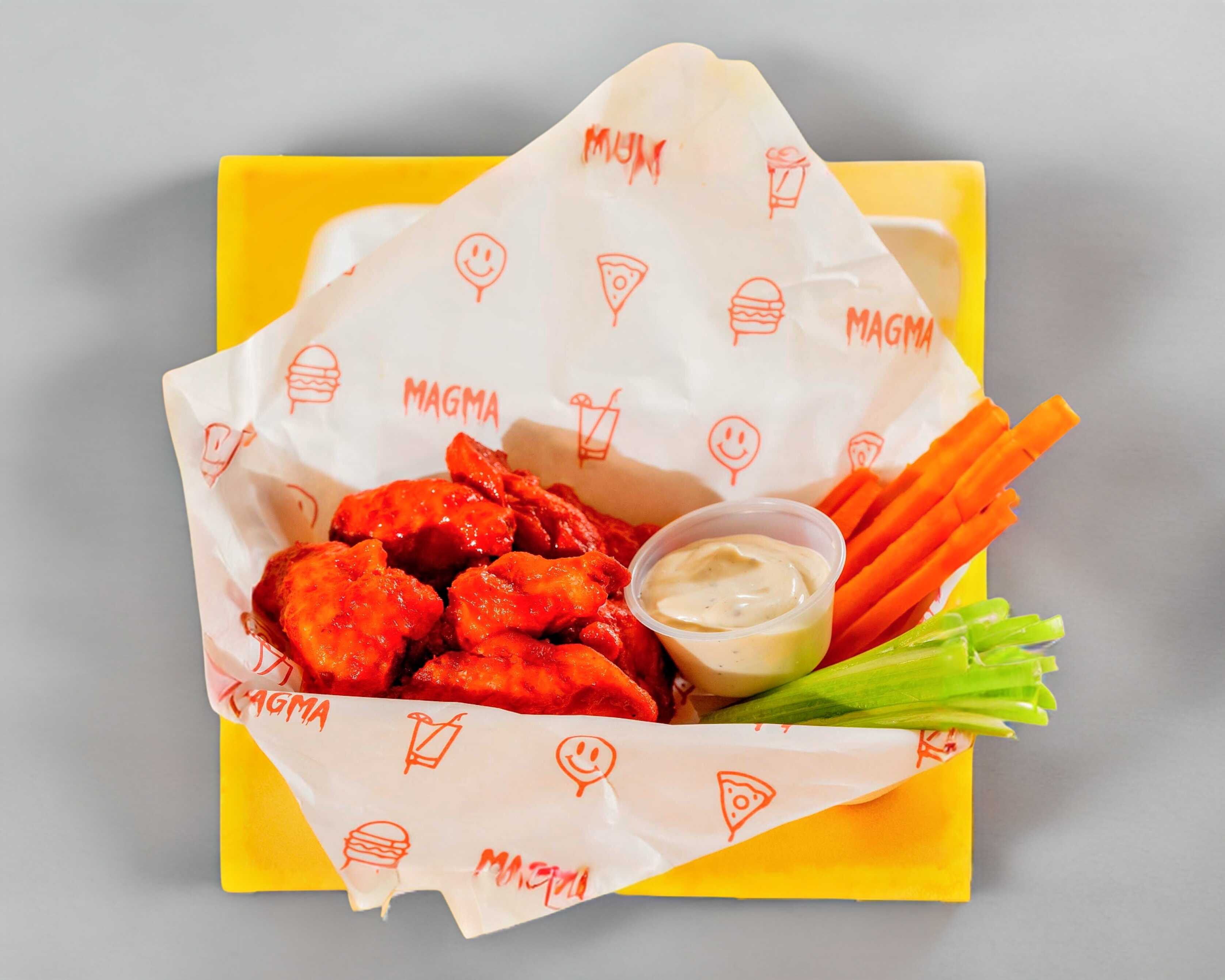 10 Piezas de crujientes alitas, elige 2 salsas y 2 aderezos. Incluye Bastones de zanahorita y apio.