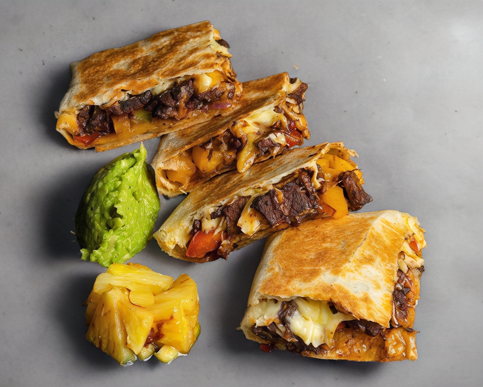 Quesadillas rellena de pastor de la casa con extra queso acompañada de piña asada, salsa habanera y salsa chipotle. Por unidad, viene divida en 4.