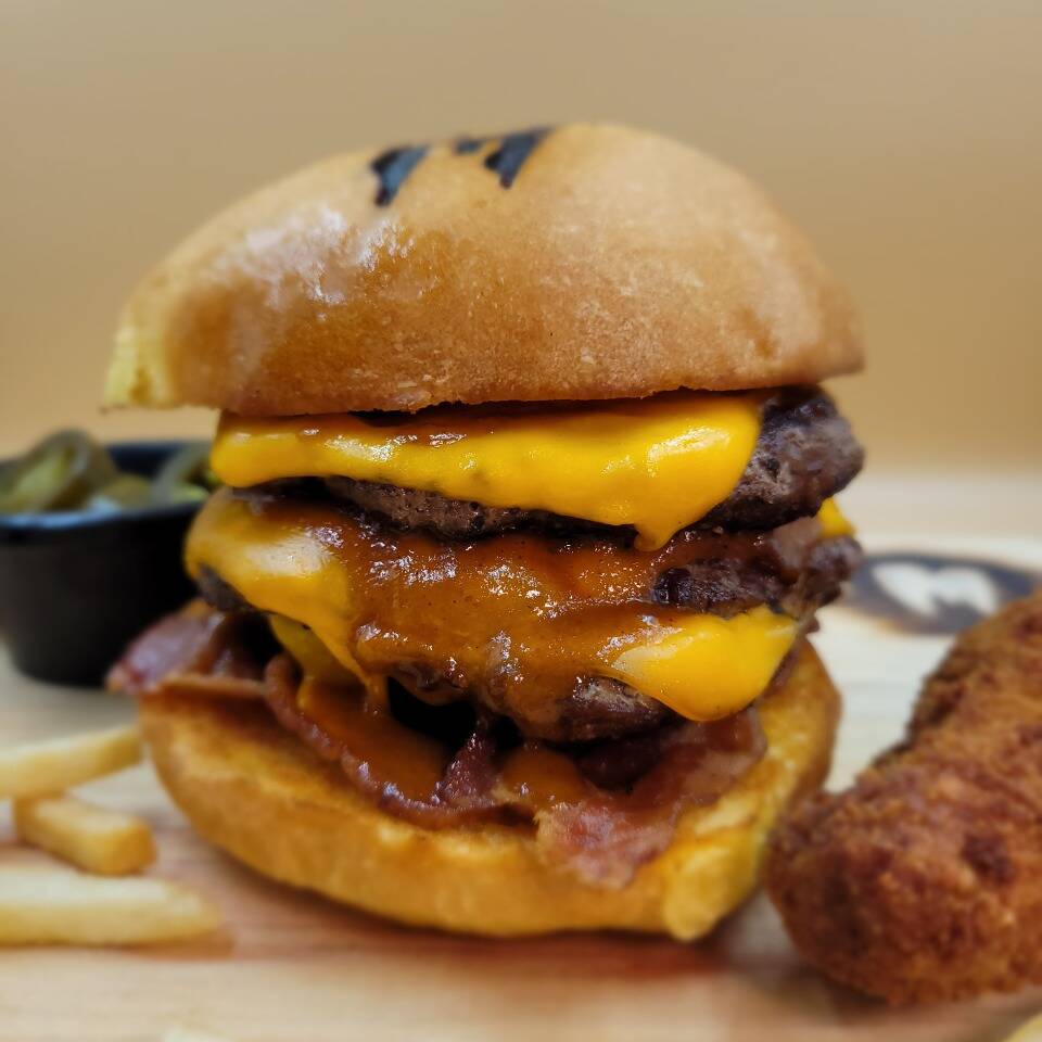 Pan brioche, 3 carnes de sirloin de 100gr cada una, tocino, queso amarillo, mayo magma y lava bbq, acompañada de papas fritas.