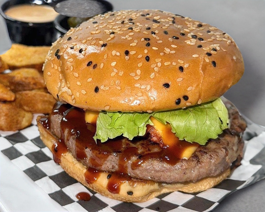 200 gramos de jugosa carne de res, acompañada de queso amarillo, tocino, aros de cebolla y bañada en salsa BBQ (No incluye papas).