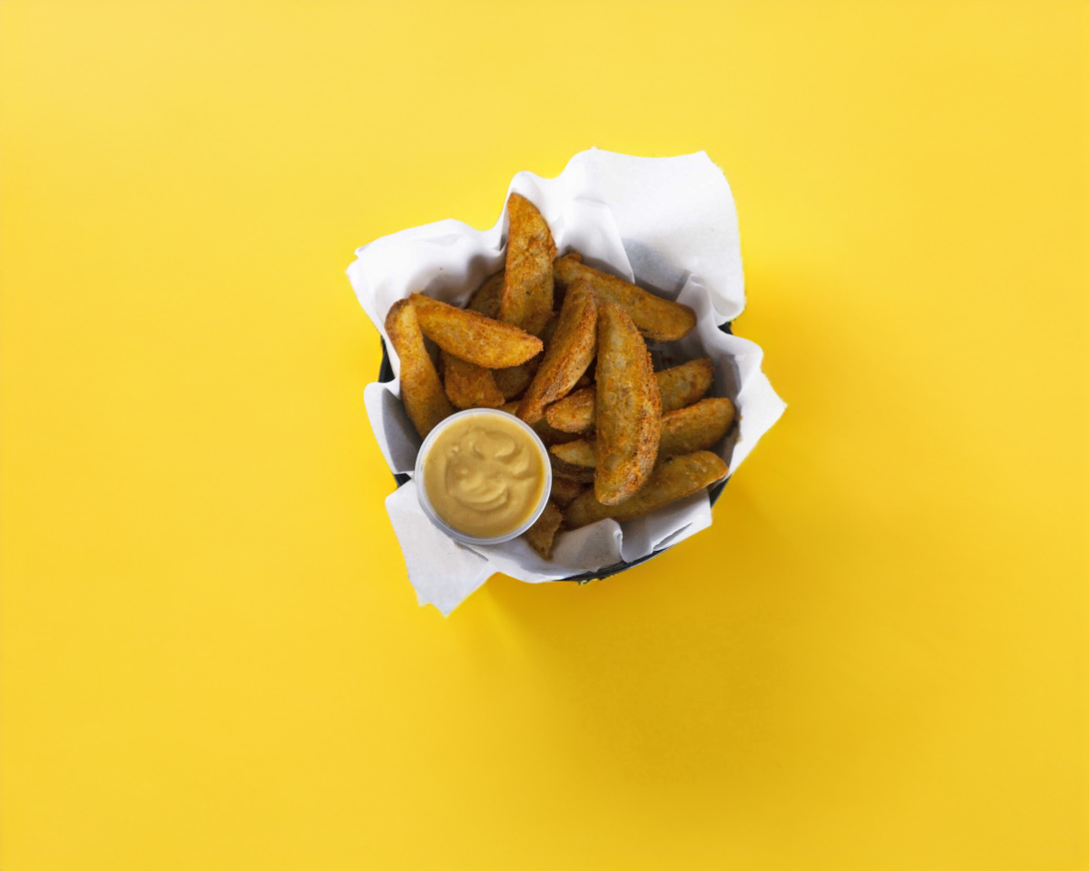 Las papas gajo, aún mejores porque están sazonadas con el toque de la casa y acompañadas con un aderezo.