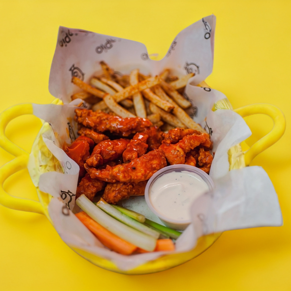 350 Gramos de pechuga empanizada, bañada en salsa, acompañado de aderezo ranch, apio y zanahoria.