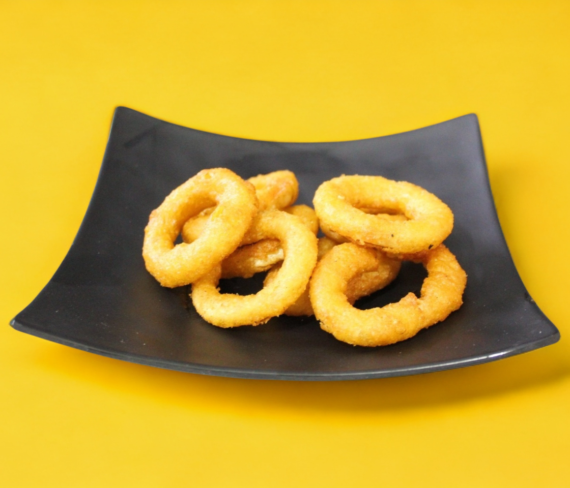 12 Piezas de crujientes aros de cebolla con aderezo.