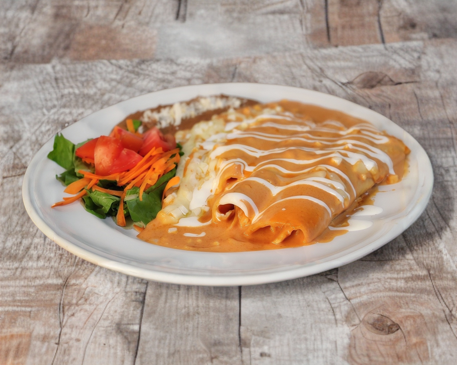 Arrachera, frijol, arroz, guacamole y enchilada roja.