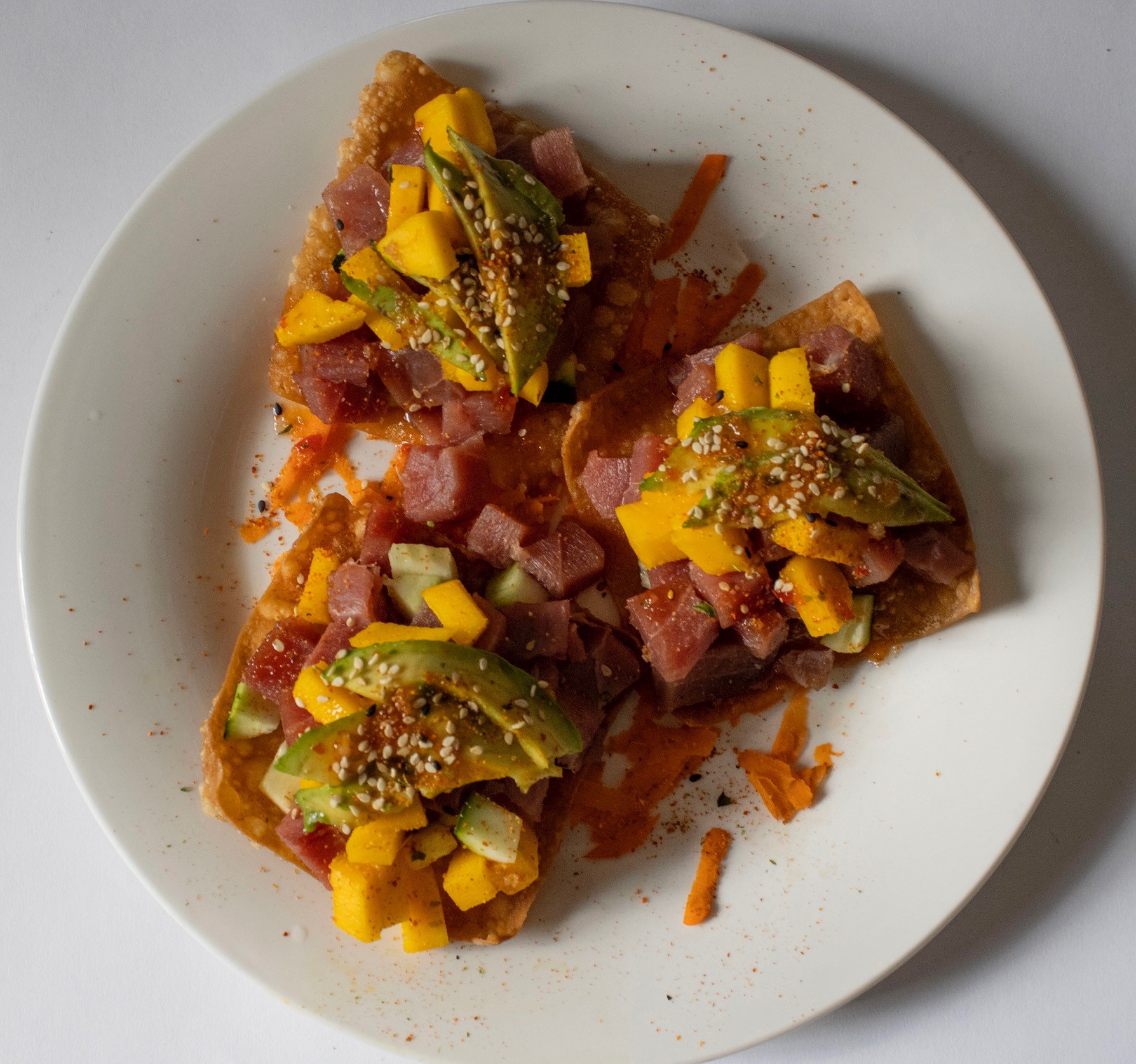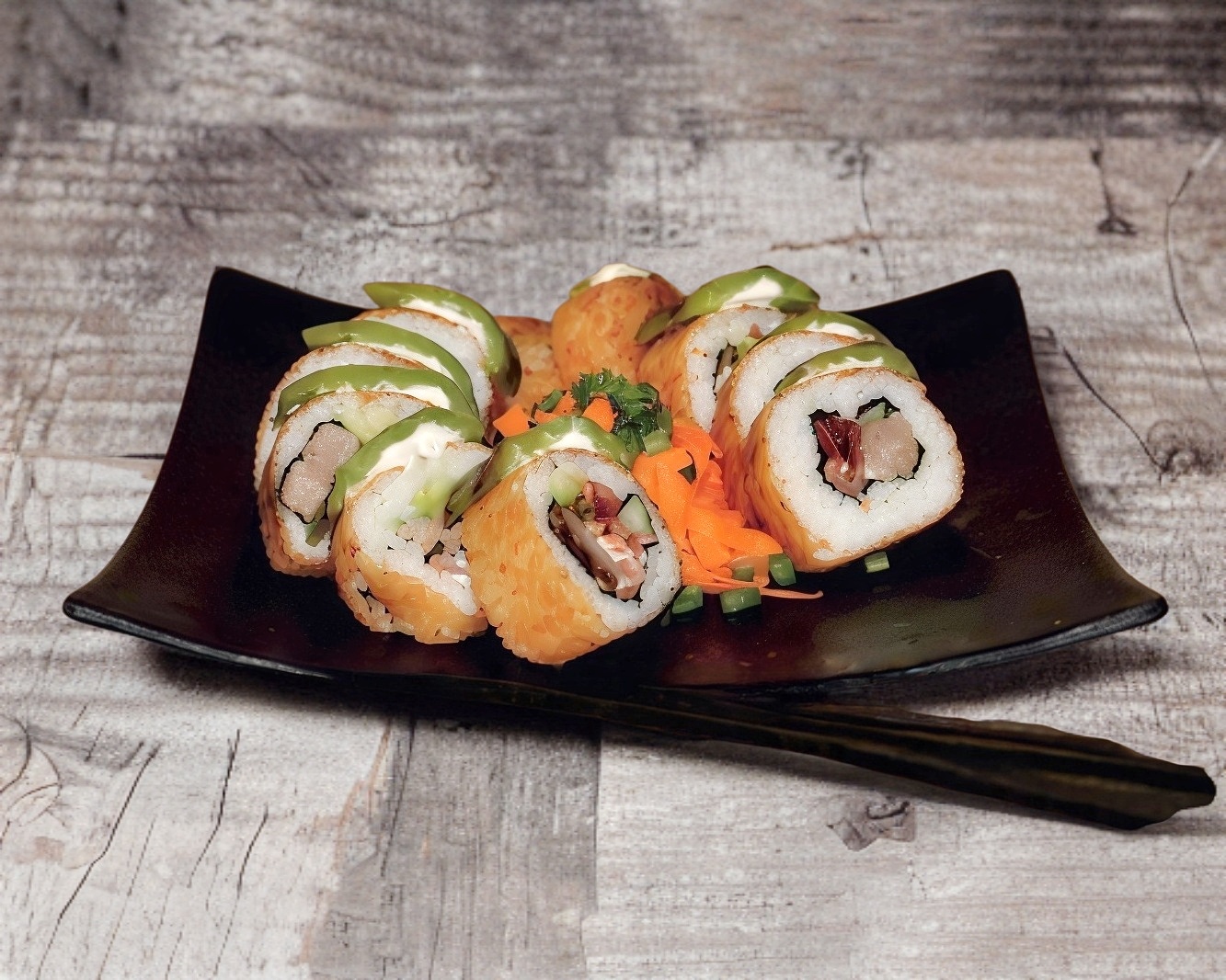 Rollo natural, por dentro pepino, aguacate, philadelphia y surimi, por fuera tocino de atún spicy.